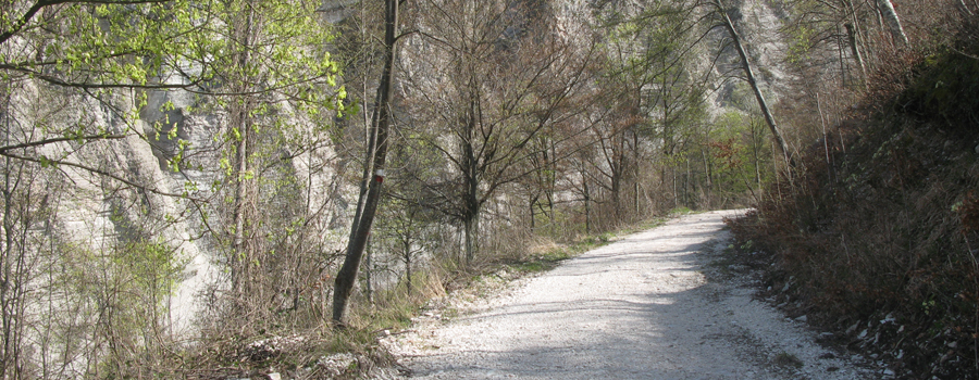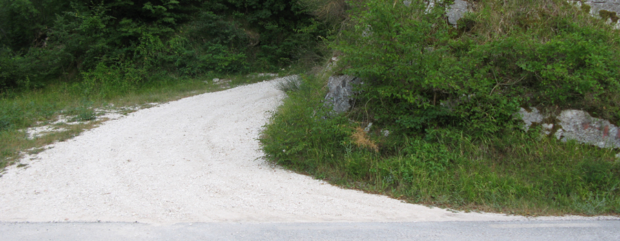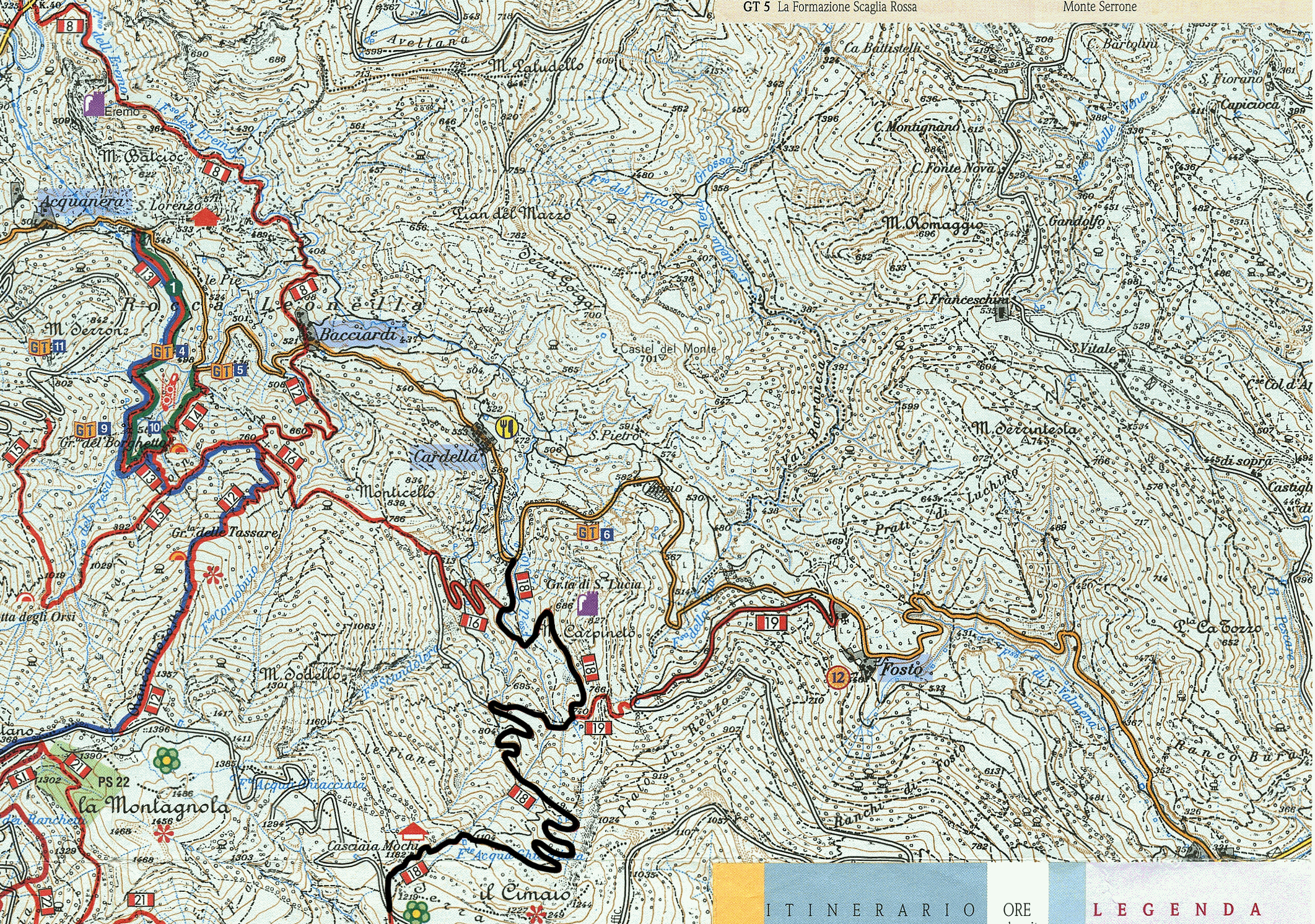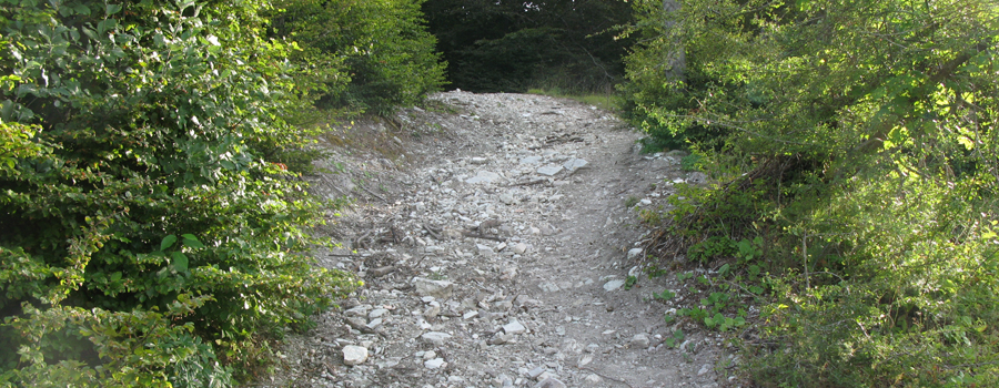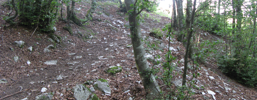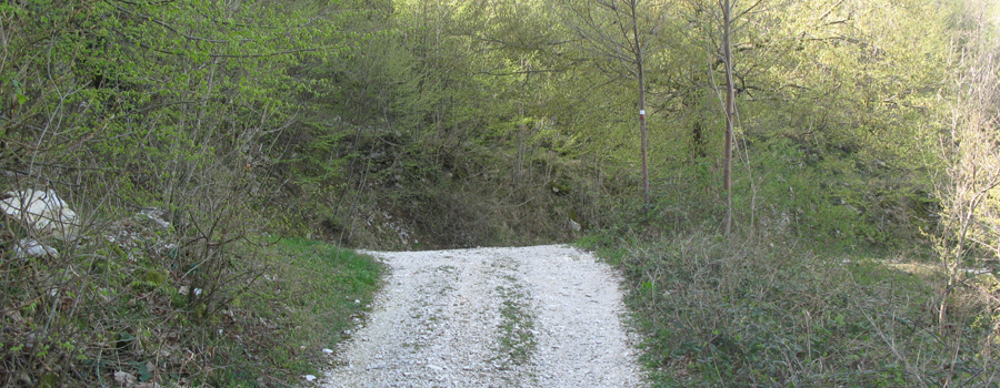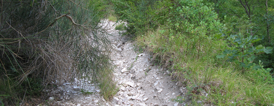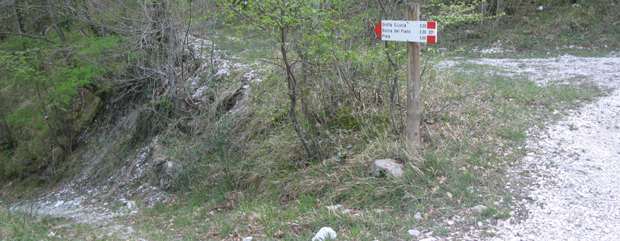 Dopo la visita alla grotta si segue il sentiero all’indietro fino all’insegna gialla (le indicazioni sono in tutto 3, due sono rosse quindi non si può sbagliare) che lo indicava, in corrispondenza di un bivio dove, questa volta, si deve svoltare verso destra ed iniziare un tratto in salita con la traccia che prosegue incerta tra gli arbusti, fino a raggiungere, un centinaio di metri più sopra, una ampia piazzola posta al termine della carrareccia che era stata abbandonata in precedenza (in questo punto confluisce anche il sentiero 19 che sale da Fosto.