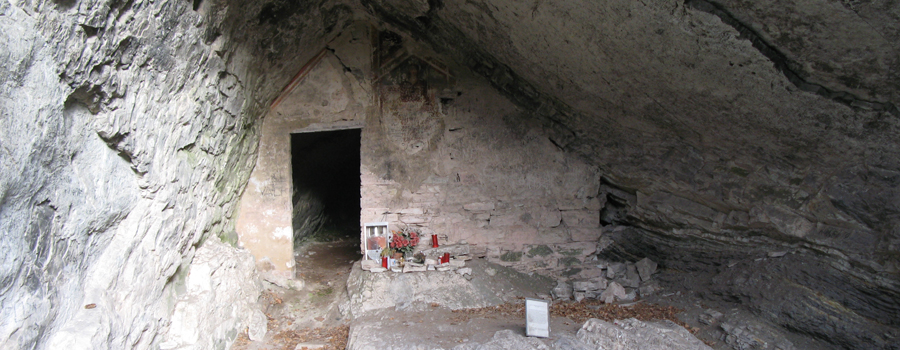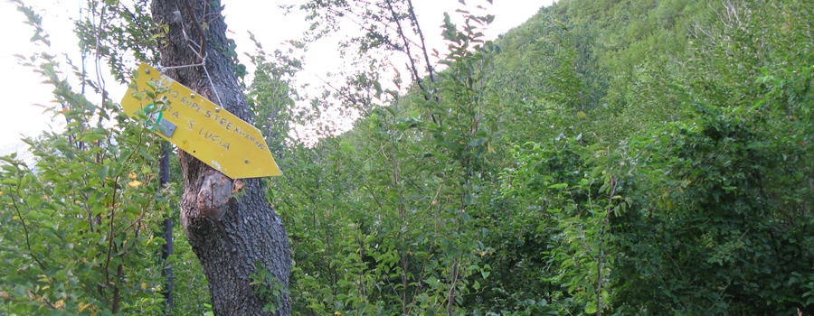 In questo tratto la vegetazione si fa più fitta, la segnatura è scarsa ma sono presenti, per fortuna, alcune insegne indicanti la Grotta di Santa Lucia, che permettono di trovare il sentierino che si diparte sulla sinistra poco dopo il fosso e che con rapida risalita (circa 50metri di dislivello) conduce alla grotta, una caratteristica formazione sul fianco della parete del Monte Carpineto, nella quale sono presenti vestigia di un antico eremo, del quale oramai rimangono solo tratti del muro che probabilmente chiudeva l’accesso alla grotta e un altare con sopra un rudimentale affresco (in pessime condizioni) raffigurante Santa Lucia. Il luogo è comunque molto suggestivo, anche per la selvaggia posizione, e merita sicuramente una sosta.