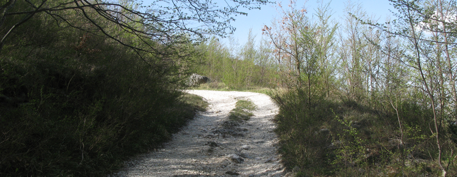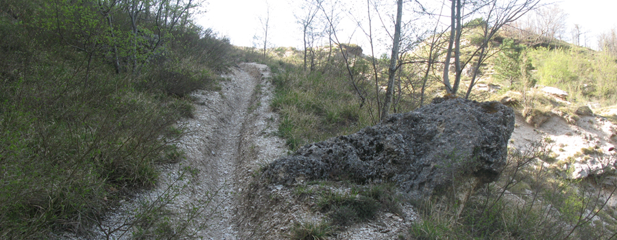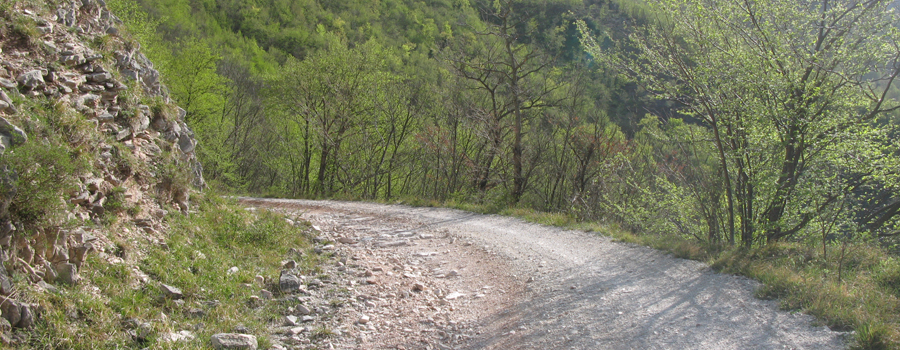 Giunti ad un secco tornante, si abbandona la strada, che continua a salire sulla sinistra verso il Cimaio, proseguendo a destra su altro breve tratto sbrecciato, che termina in corrispondenza di una piccola piazzola, dalla quale occorre individuare un sentierino che sale in maniera piuttosto ripida verso la soprastante sella che scende dal Monte Carpineto.