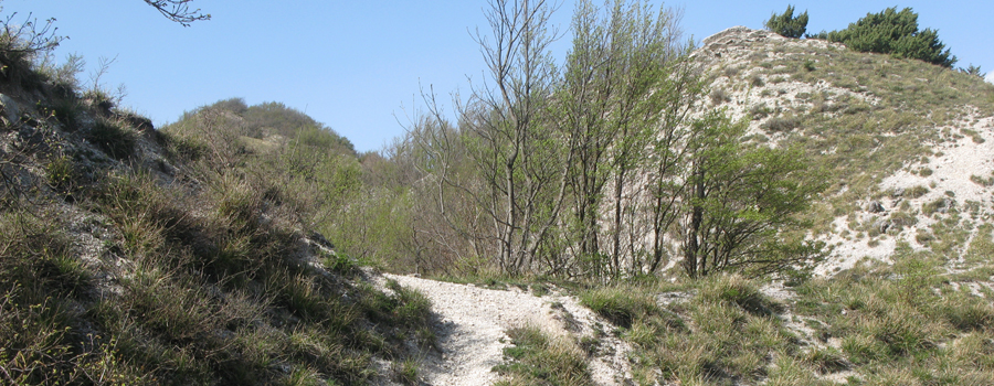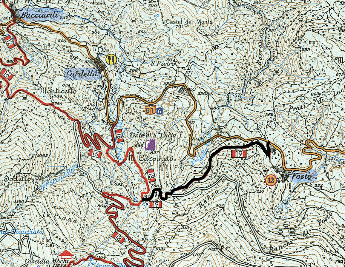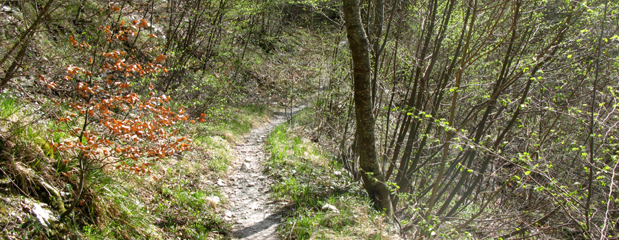 Il tratto è più impegnativo ma piuttosto breve, e raggiunta la sella ci si addentra nel bosco in leggera discesa, proseguendo per qualche centinaio di metri fino a raggiungere un'ampia spianata, dove il sentiero termina incrociando il sentiero 18 (la segnatura di quest'ultimo percorso è ben evidente) che scende dalla Casciaia Mochi.