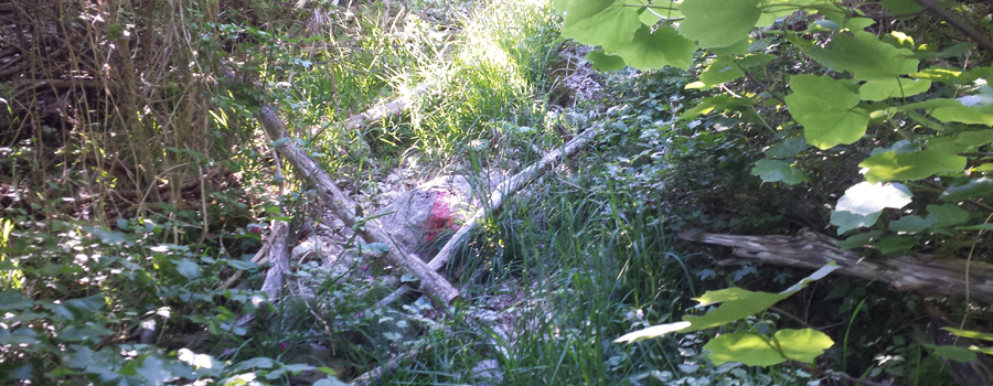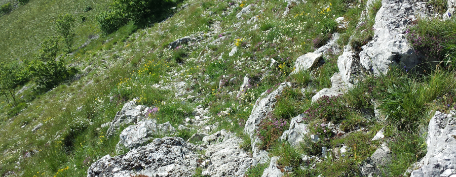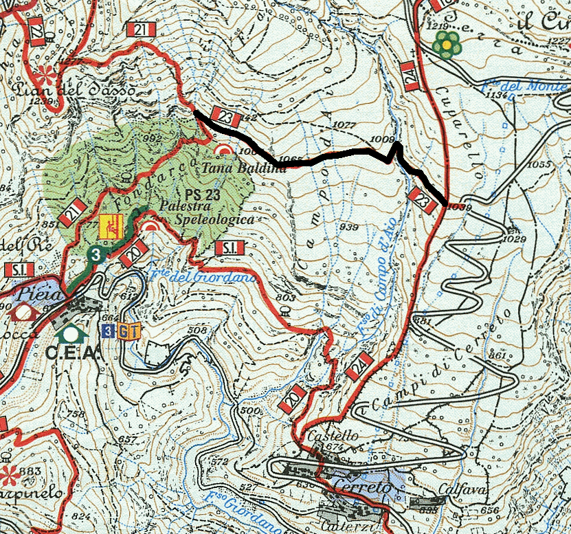 Il percorso termina incrociando il sentiero 21 che sale da Pieia e conduce in vetta alla Montagnola, ma di fatto il tratto in salita oltre l’incrocio è piuttosto complicato da individuare e la natura si è quasi interamente riappropriata del tracciato. Anche lo stesso attacco in discesa non è facilissimo da vedere, occorre fare attenzione in quanto è l’unica via d’uscita da questa impervia zona… Nelle vicinanze del bivio, poco dopo aver imboccato il 21, merita una visita la Tana Baldina, splendida formazione carsica consistente in un grande riparo sottostante una parete rocciosa.