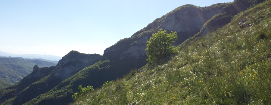Qui si abbandonano gli ampi pascoli per immergersi nel bosco, ai piedi delle imponenti pareti rocciose che caratterizzano questo lato del Nerone. Il sentiero, in questo tratto, è veramente poco battuto e alcuni vecchi segni sbiaditi sono l’unico appiglio per riuscire a seguire la giusta via in un ambiente dove è veramente semplice perdersi (fare attenzione, ci sono tratti piuttosto scoscesi che potrebbero risultare pericolosi).