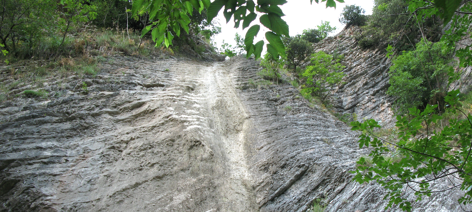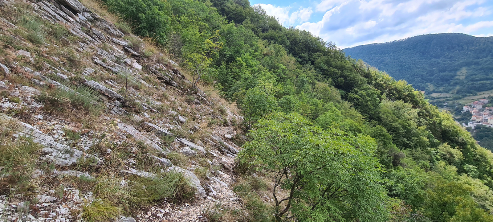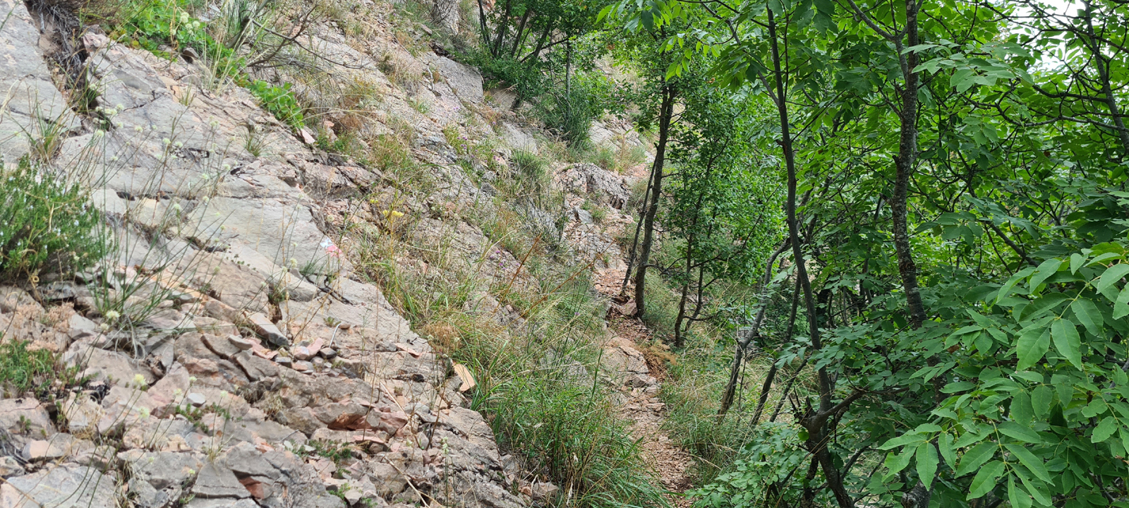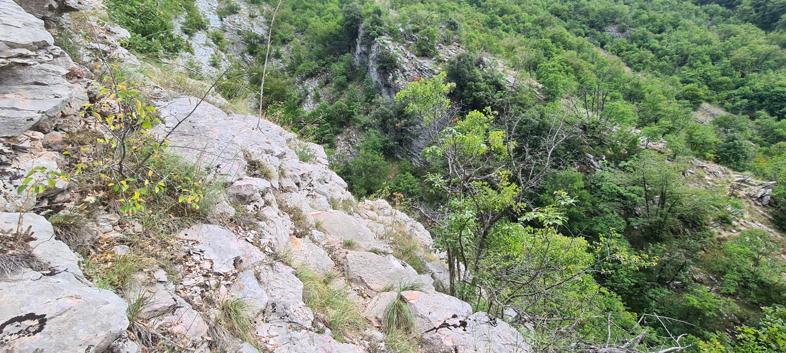 Oltrepassata la forra bisogna fare attenzione ad un tratto molto esposto, dove è stata fissata una corda per agevolare il passaggio, da utilizzarsi soprattutto nelle stagioni umide quando il fondo può essere parecchio scivoloso. Successivamente il sentiero sale su alcune rocce, sono passaggi non troppo impegnativi ma è comunque necessario l’uso delle mani, seguito da continui saliscendi con il paesaggio che si apre decisamente sulla destra, lasciando ammirare un bel panorama sulla valle sottostante e sull’abitato di Valdara.