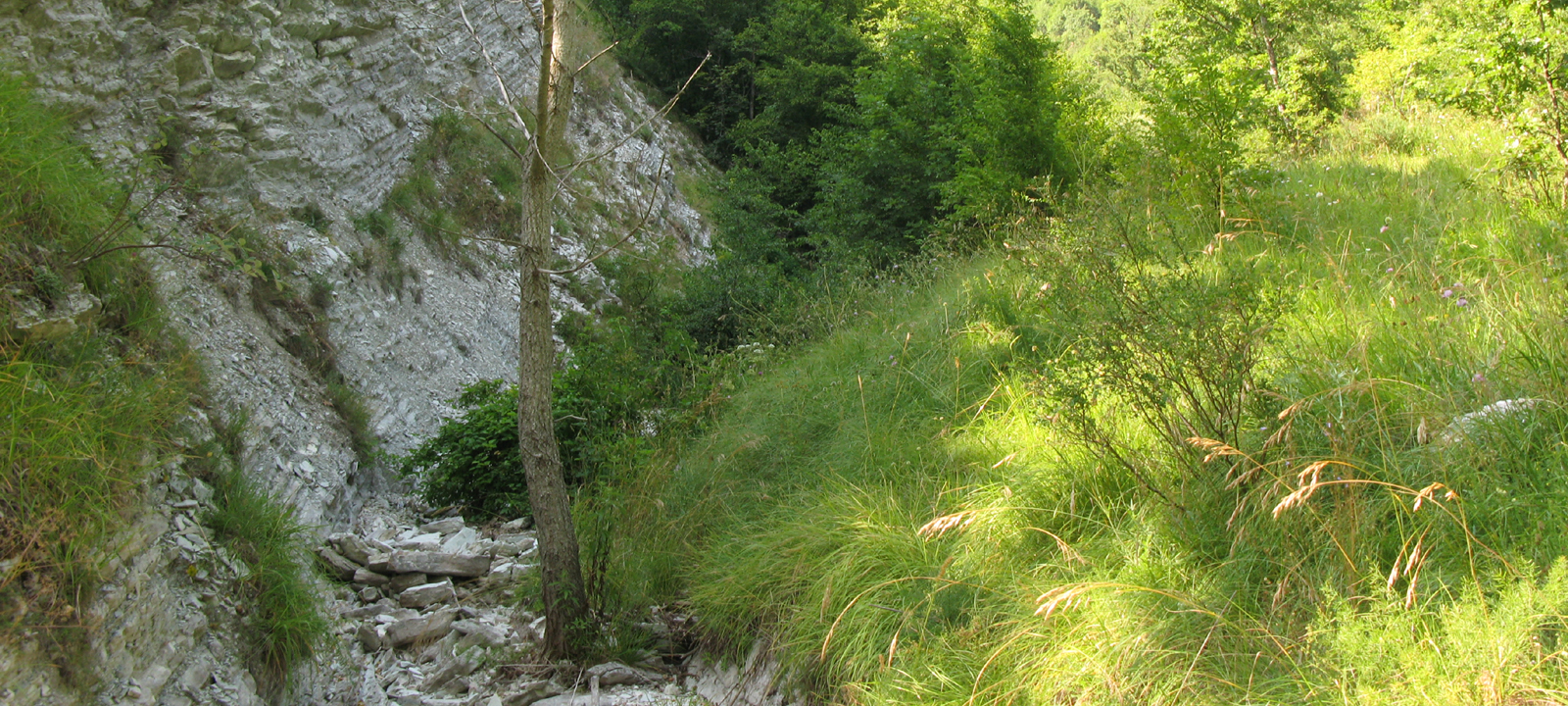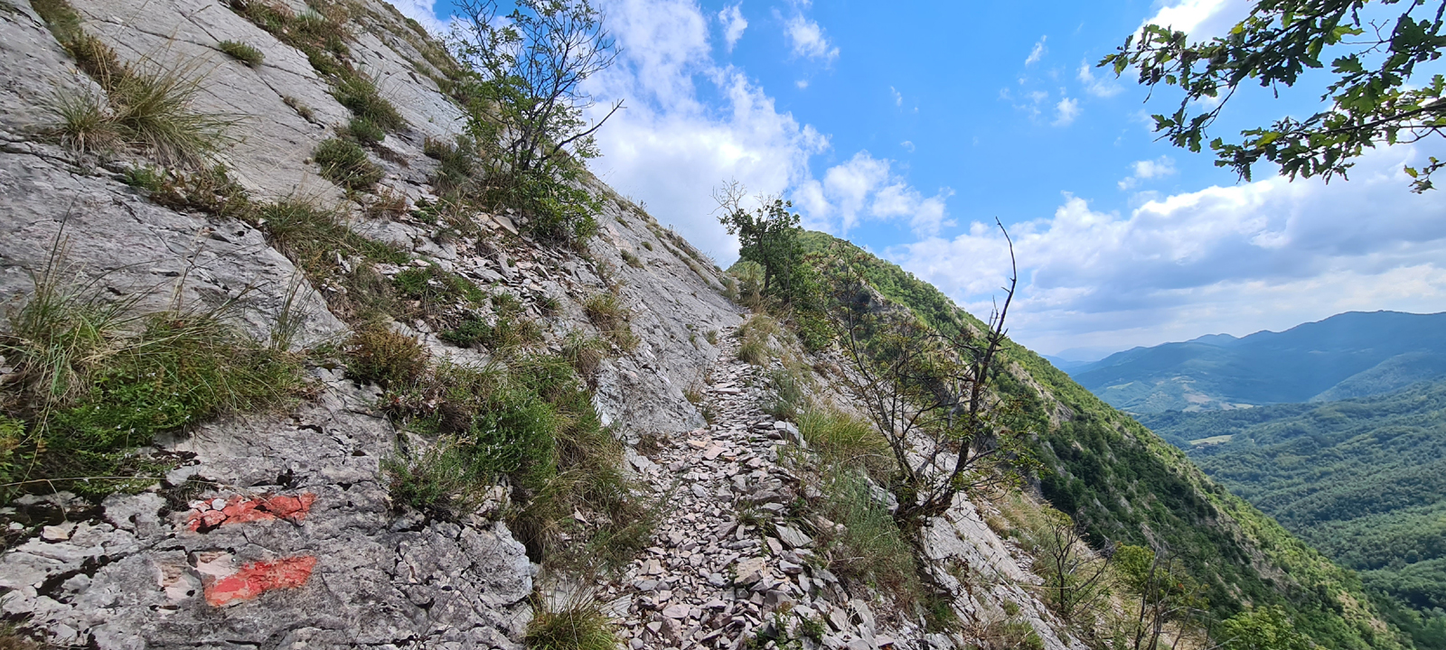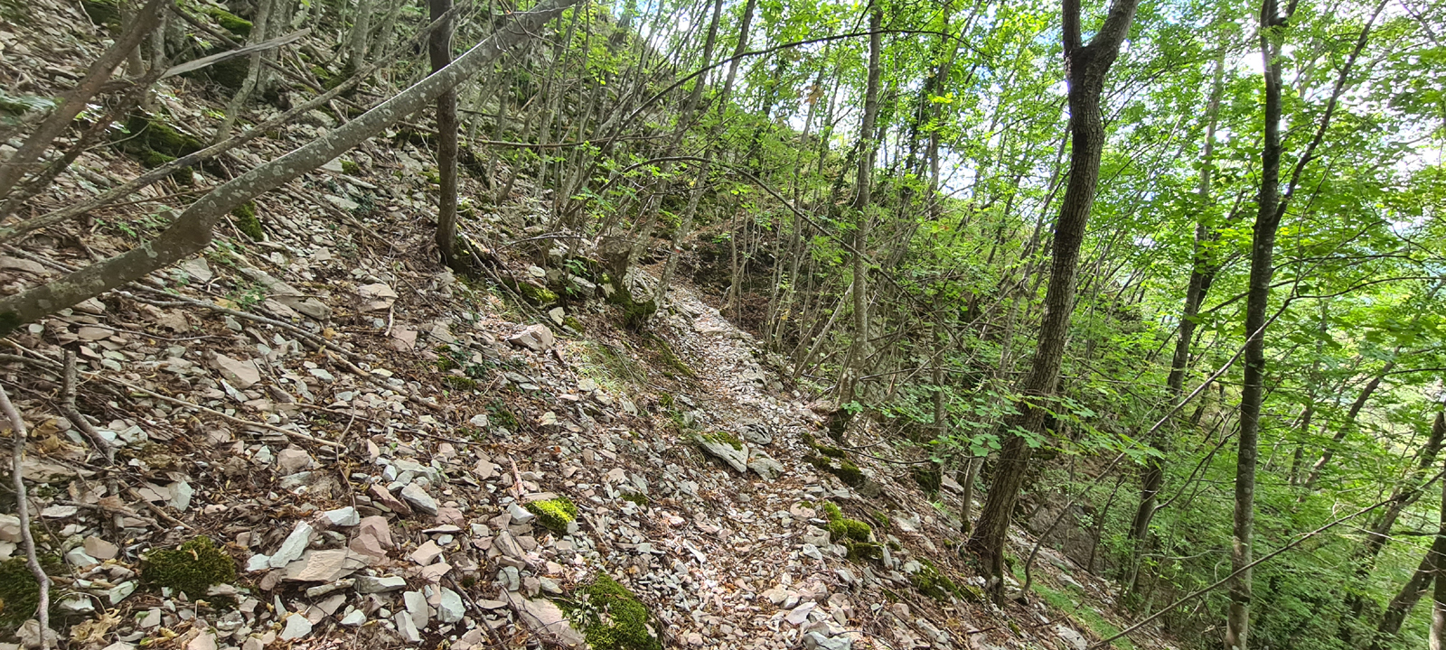 Il percorso prosegue alternando tratti in cui si immerge nel bosco a passaggi esposti e panoramici, incontra il bivio con il nuovo sentiero che permette di affrontare la bella cresta del Cambusone, fino a raggiungere l’alveo del Fosso di Trilla (anche qui a poca distanza vi è una bella forra su cui si pratica torrentismo), oltrepassato il quale si esce in breve su di un ampio prato dal quale si diparte una stradina che conduce alla carrozzabile che sale da Pieia verso la vetta del Monte Nerone.