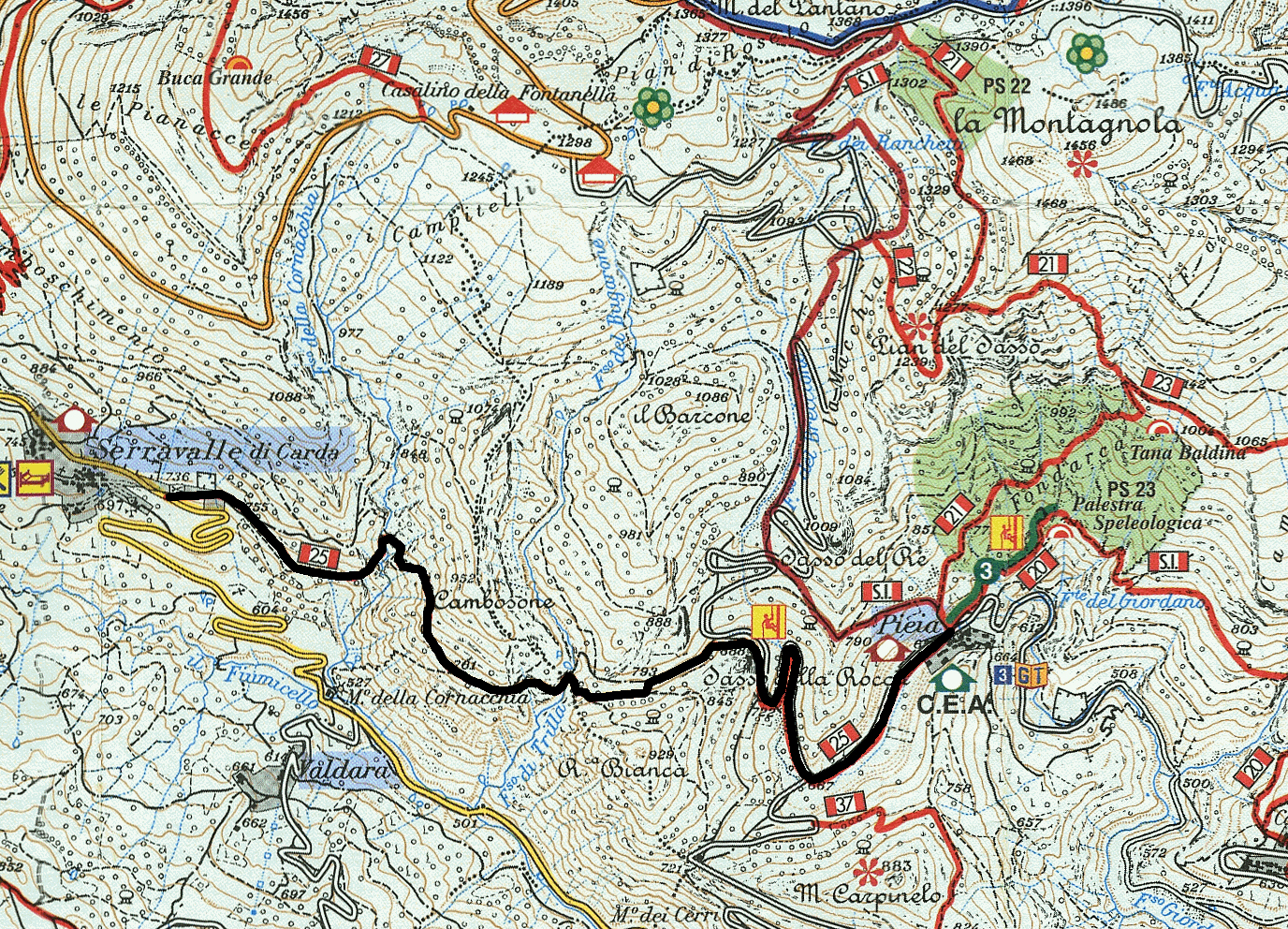 Il sentiero 25 è un interessante itinerario che conduce da Serravalle di Carda a Pieia, attraversando una zona selvaggia ed impervia e che va affrontato con cautela in quanto, nonostante il dislivello affrontato sia esiguo, presenta numerosi tratti abbastanza esposti e passaggi su roccette che necessitano una certa cautela.
