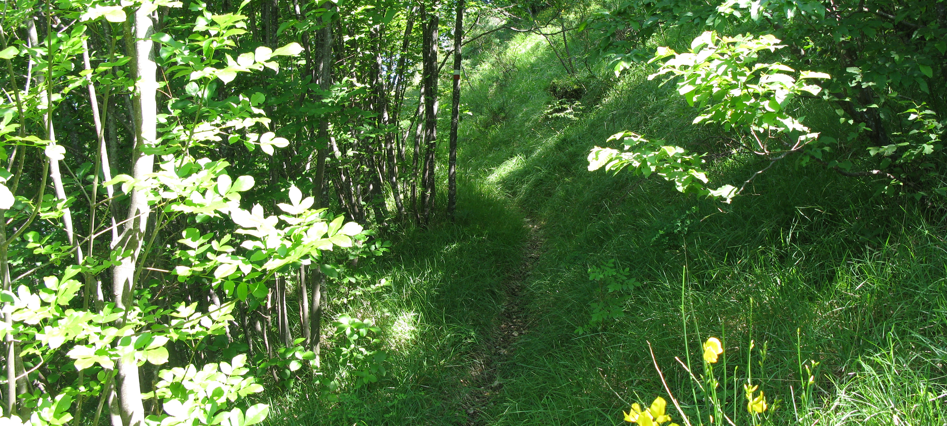 Nella parte finale si abbandona la strada per imboccare un sentiero (incrocio recentemente risegnato con segno di un albero contenente il numero del percorso) che si stacca sulla destra e si inoltra nel fitto bosco, con traccia molto evidente.