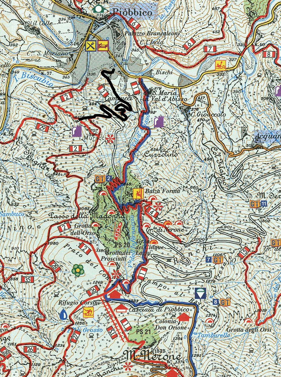 Una volta entrati nel bosco si affronta la salita finale (ancora caratterizzata da facili pendenze) che conduce fin sotto i ruderi dei Muracci, ciò che resta dell’antica residenza dei Brancaleoni, signori di Piobbico, dove uscendo sul filo di cresta si incontra il sentiero 2 che sale verso il Rifugio Corsini.