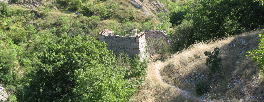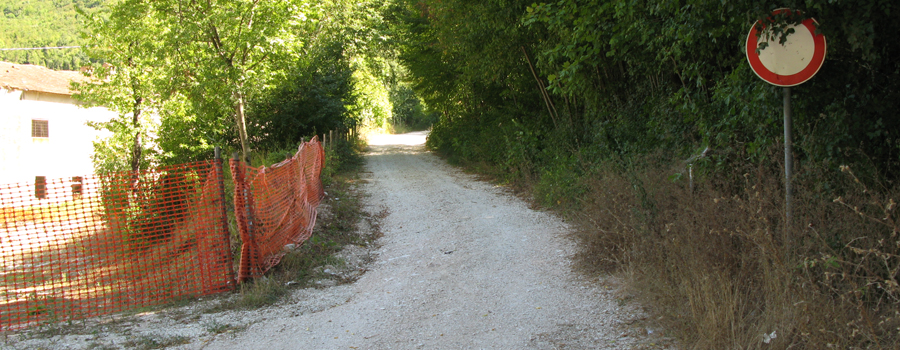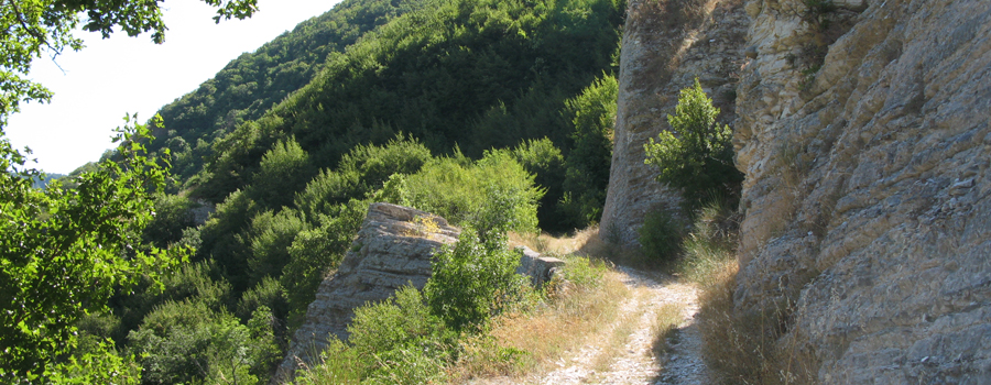 Proseguendo sulla strada, invece, si inizia la salita, che è piuttosto comoda in questo primo tratto, effettuato costeggiando le belle pendici rocciose dei rilievi secondari del Cardamagna (non sono presenti segni di nessun tipo ma l'orientamento qui è semplicissimo, essendo sufficiente seguire la strada...) fino al punto in cui si raggiungono i resti di un vecchio mulino, sulla sinistra, dove occorre far attenzione nel trovare la debole traccia che aggira i ruderi, supera in un facile guado il Fosso del Mulino e si inerpica sul versante opposto. Una sosta in questo luogo è d'obbligo, perché è presente una splendida cascata che un tempo alimentava il mulino.