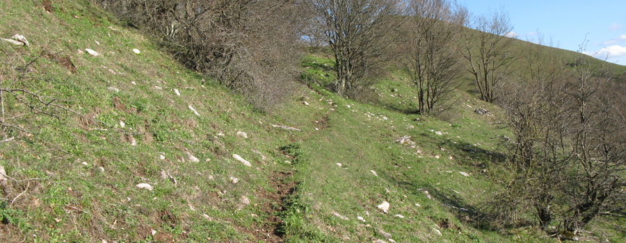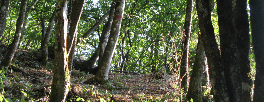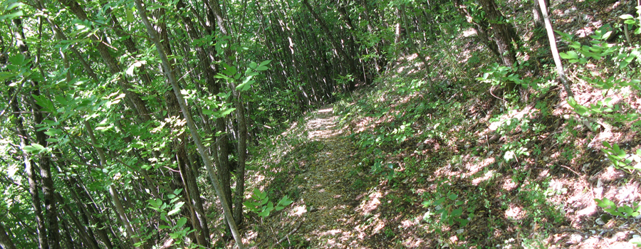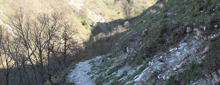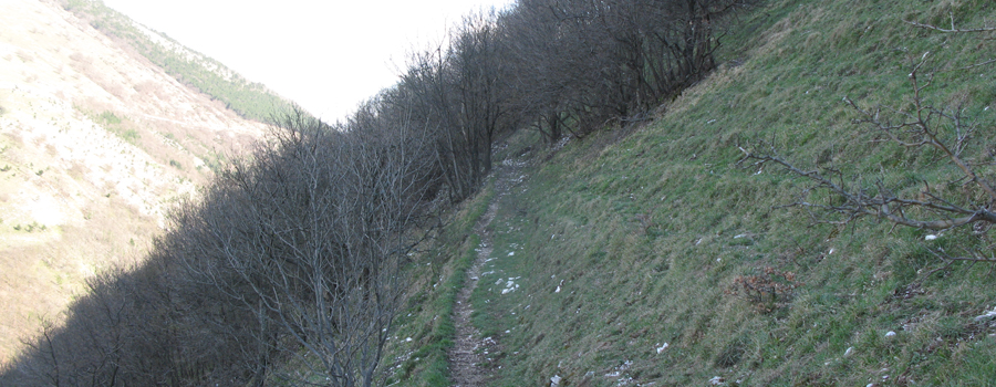 Da questo punto in poi la salita si fa improvvisamente dura e l'orientamento molto più complesso, in quanto il sentiero prosegue nel bosco e la segnatura è fortunatamente ancora presente ma molto datata, con il risultato che perdersi non è affatto un evento improbabile... In particolare occorre fare attenzione al bivio con il sentiero 33 (il 31 sale sulla destra) e soprattutto, poco dopo, ad un punto in cui è necessario effettuare un traverso su di un prato (segno su albero), con la traccia che invece apparentemente prosegue nel bosco (portando a perdersi)...