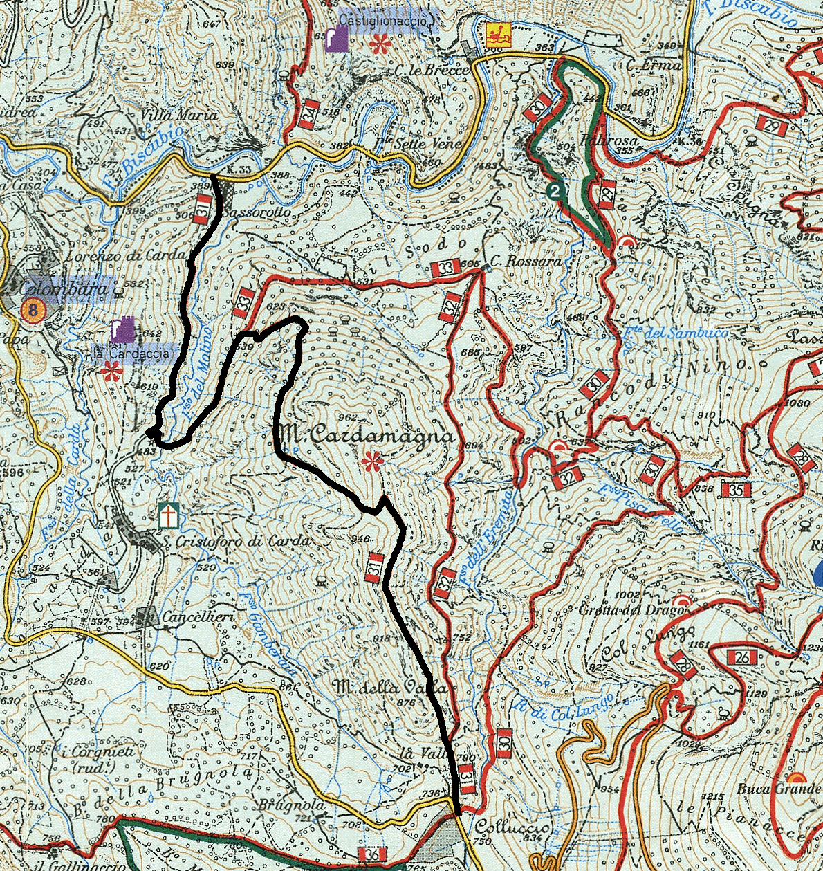 Subito dopo la partenza si può notare, sulla destra su un palo della luce, il segno indicante il bivio con il sentiero 31bis, che conduce agli interessanti ruderi di una delle antiche fortificazioni dei Conti Ubaldini di Apecchio, "La Cardaccia".
