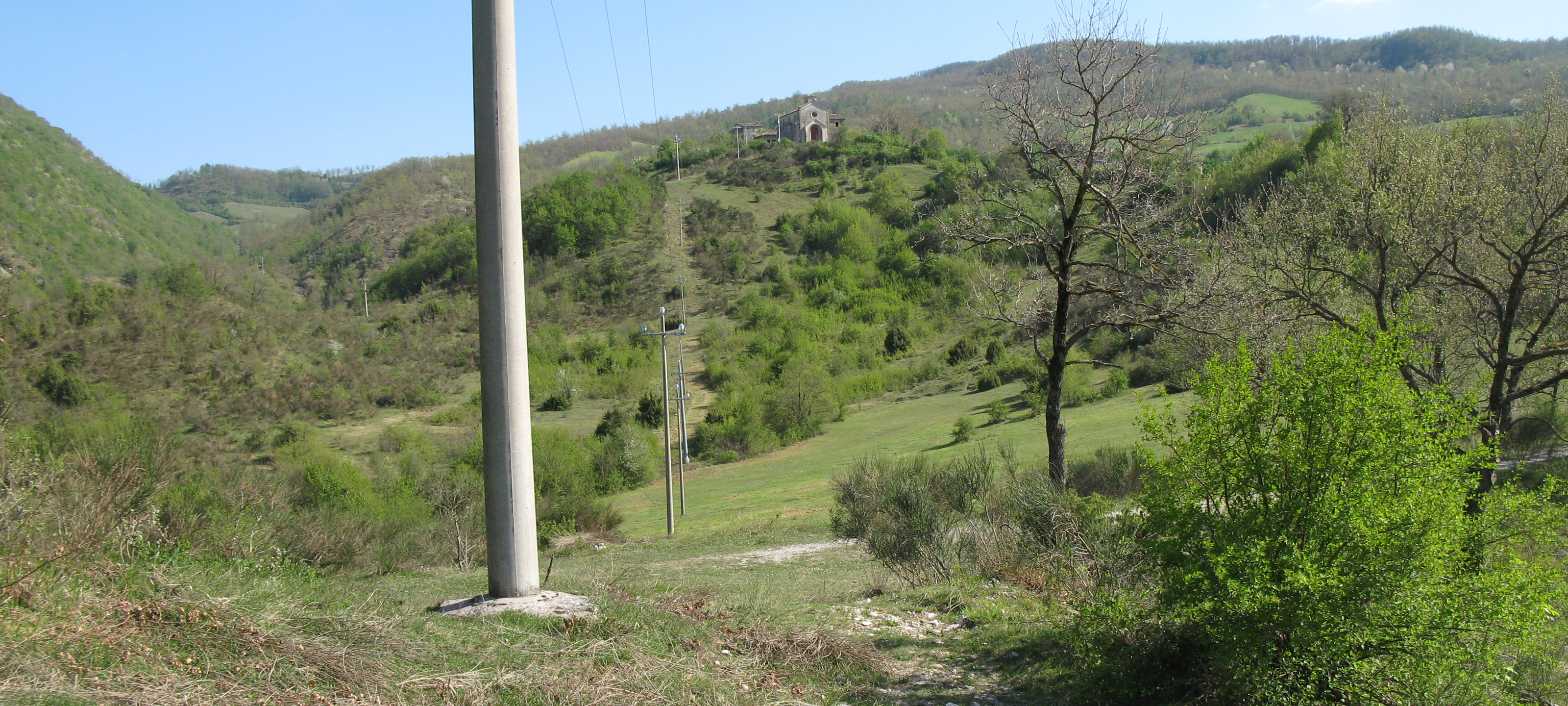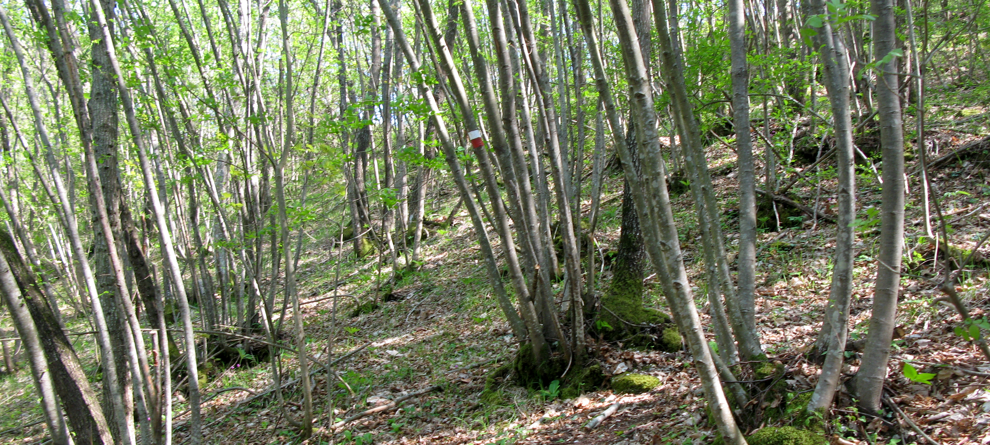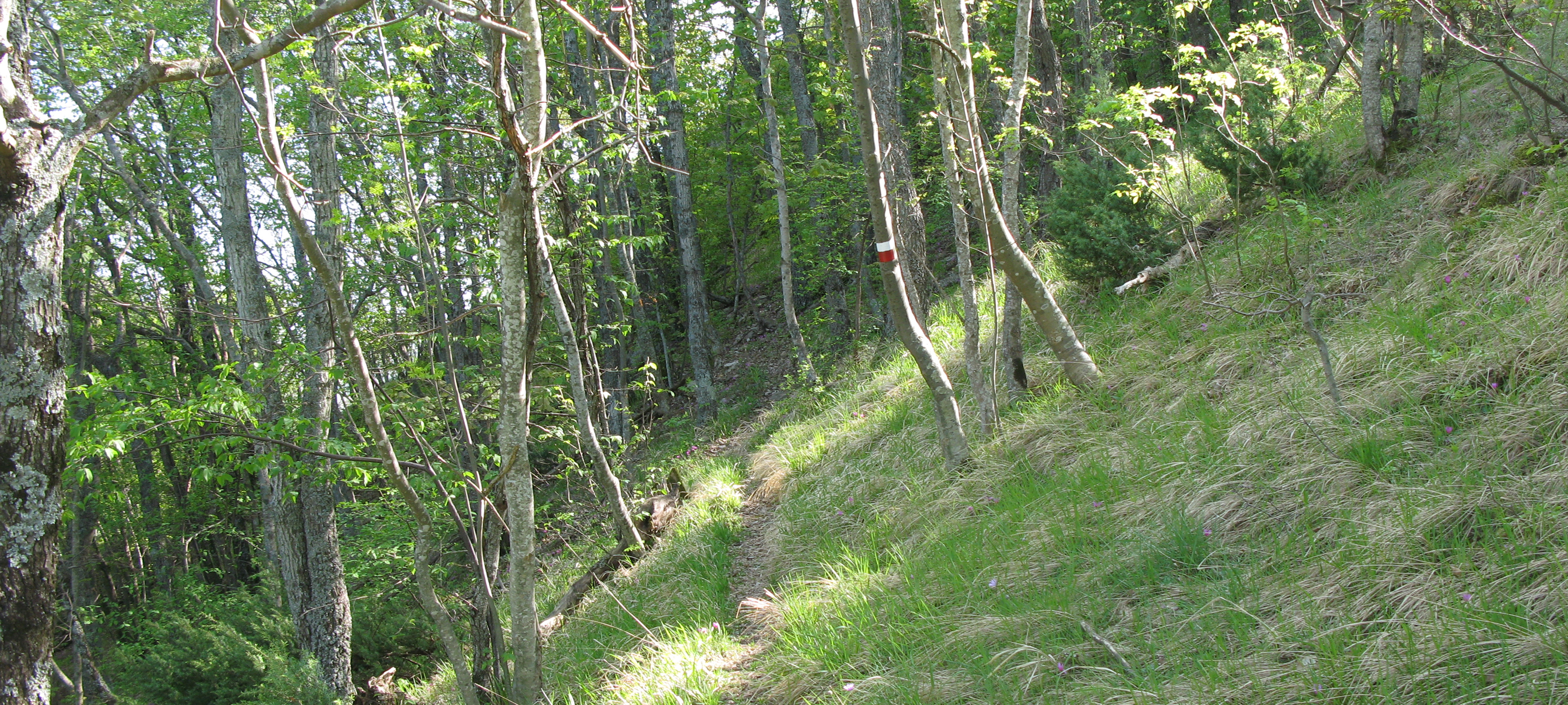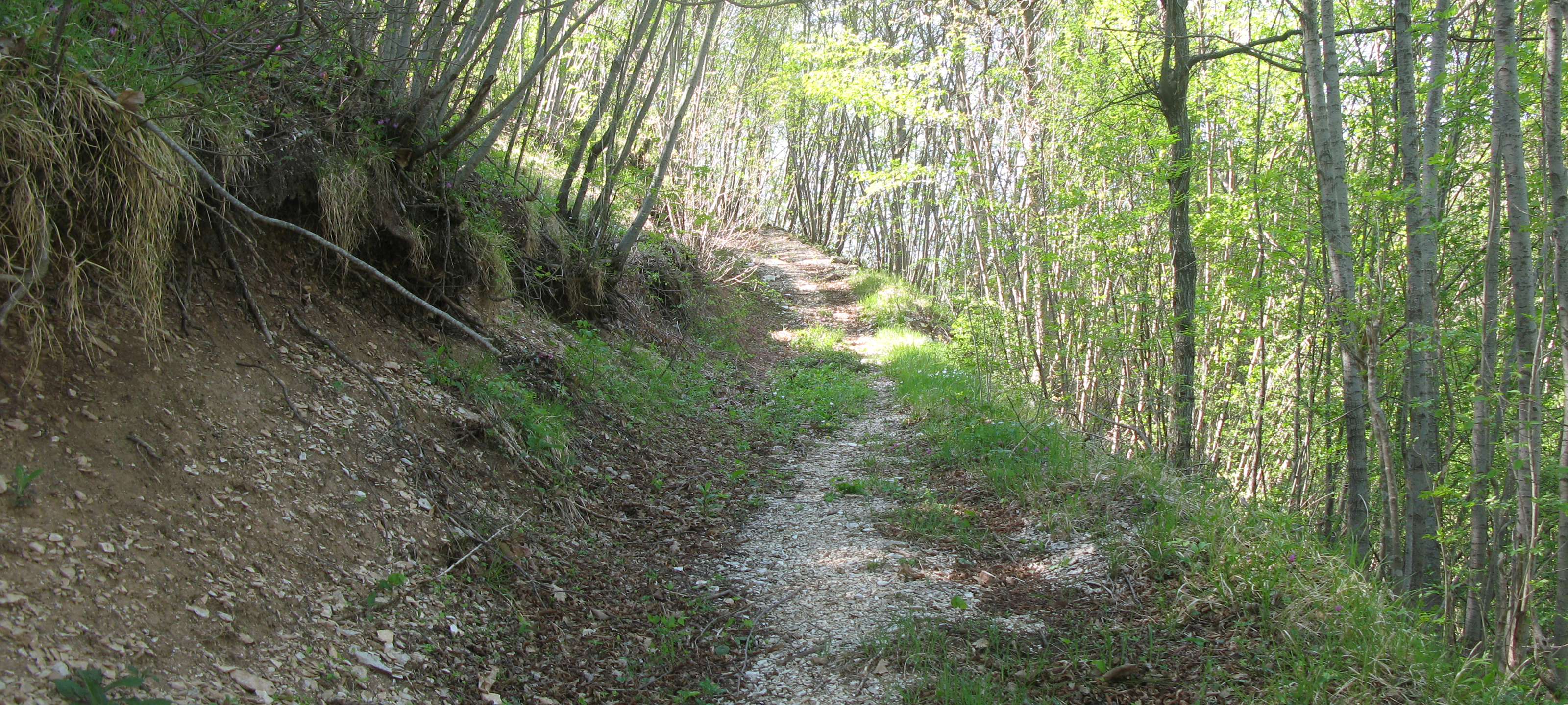 Superata la prima dura rampa, il percorso spiana e sbuca in un tratto più aperto e pianeggiante, da percorrere per alcune centinaia di metri seguendo i pali della luce, fino ad una svolta a sinistra (fare attenzione al segno sull’albero per individuarla, il sentierino non è evidentissimo) da dove si ricomincia a salire, nuovamente all’interno del bel bosco composto da alberi a basso fusto.