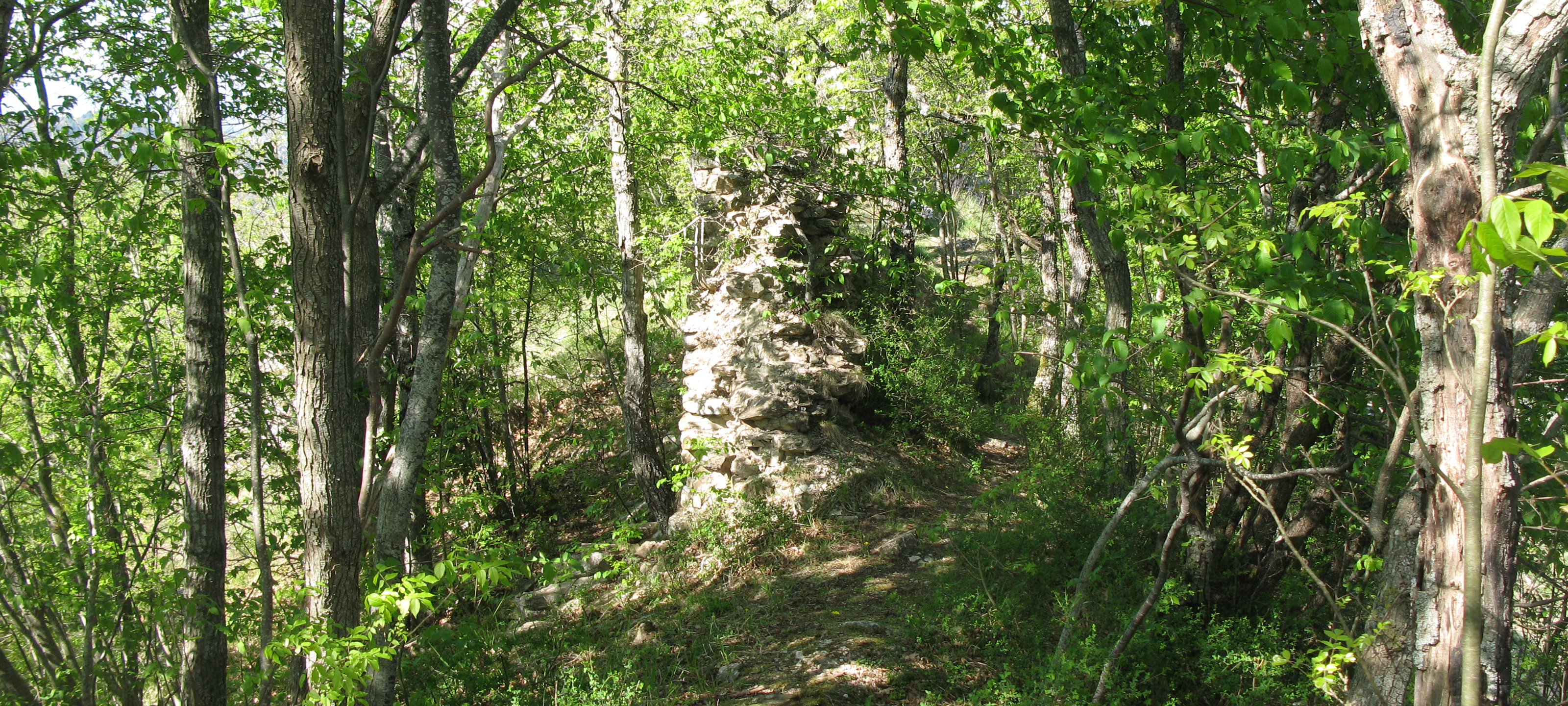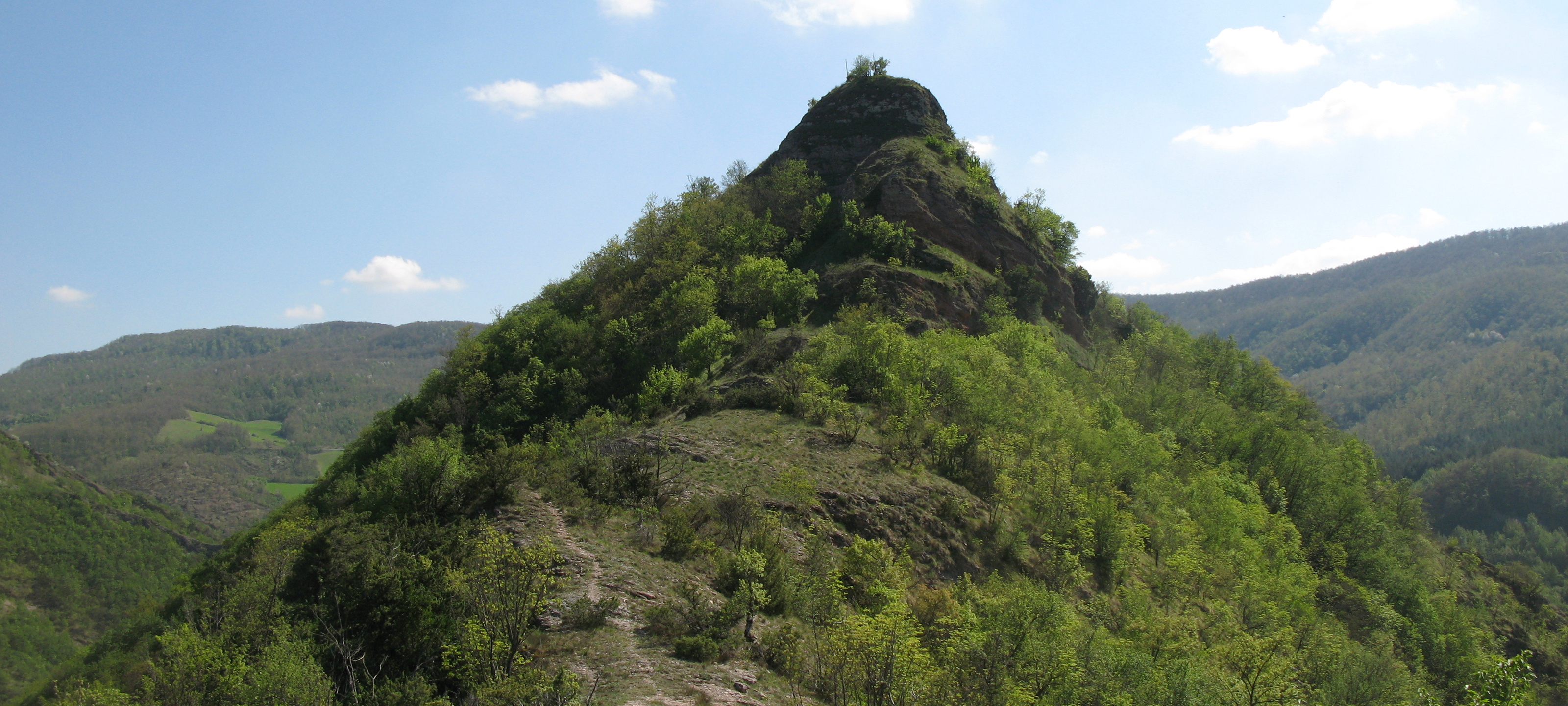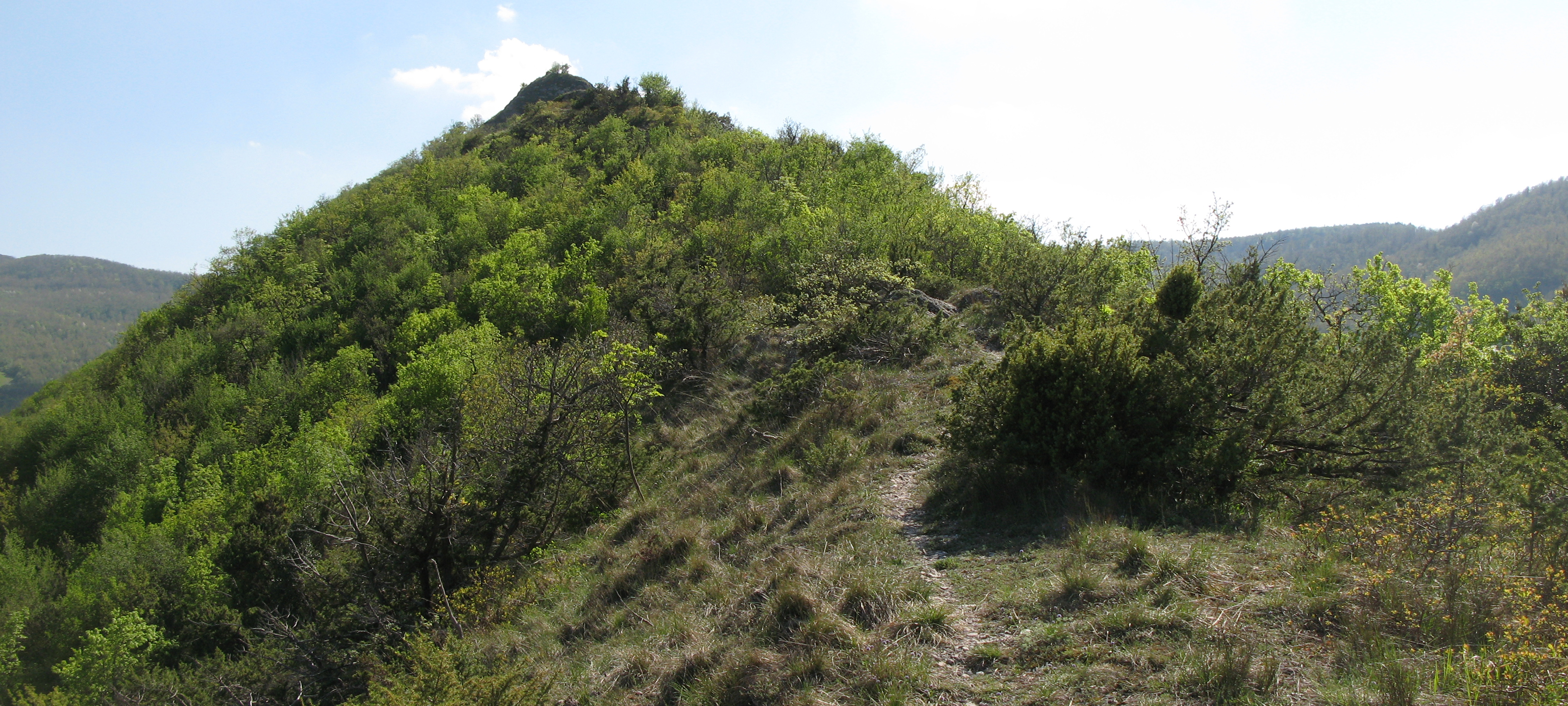 Superata un’ultima svolta a destra si iniziano a vedere tutt’attorno i ruderi della Cardaccia, che un tempo era una grande fortificazione, ed in breve si raggiunge uno sperone roccioso alto una decina di metri, sul quale si può salire (la roccia è solida e presenta degli “scalini” naturali che facilitano l’ascesa) raggiungendo la panoramica vetta, dalla quale si può godere appieno del panorama che ora spazia a 360° sulle vallate circostanti.