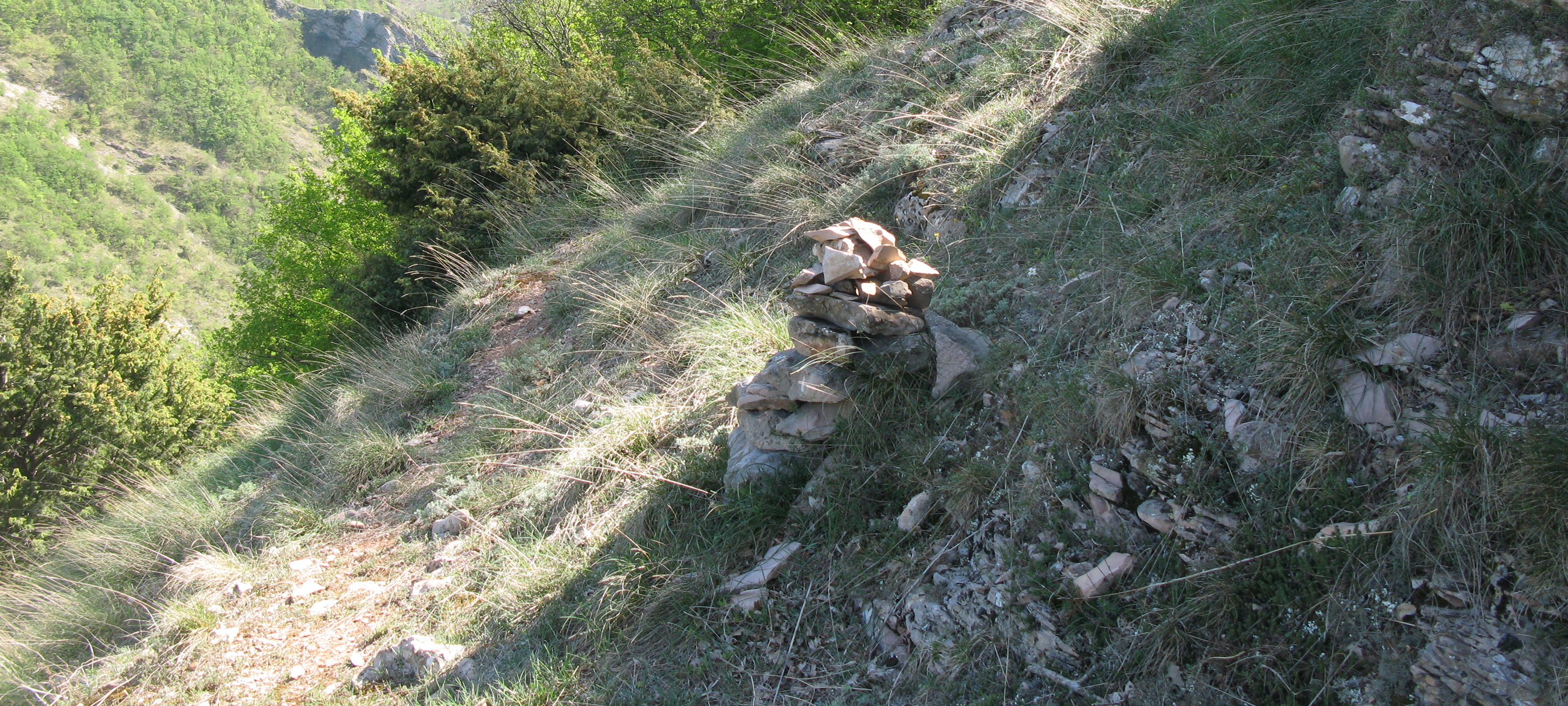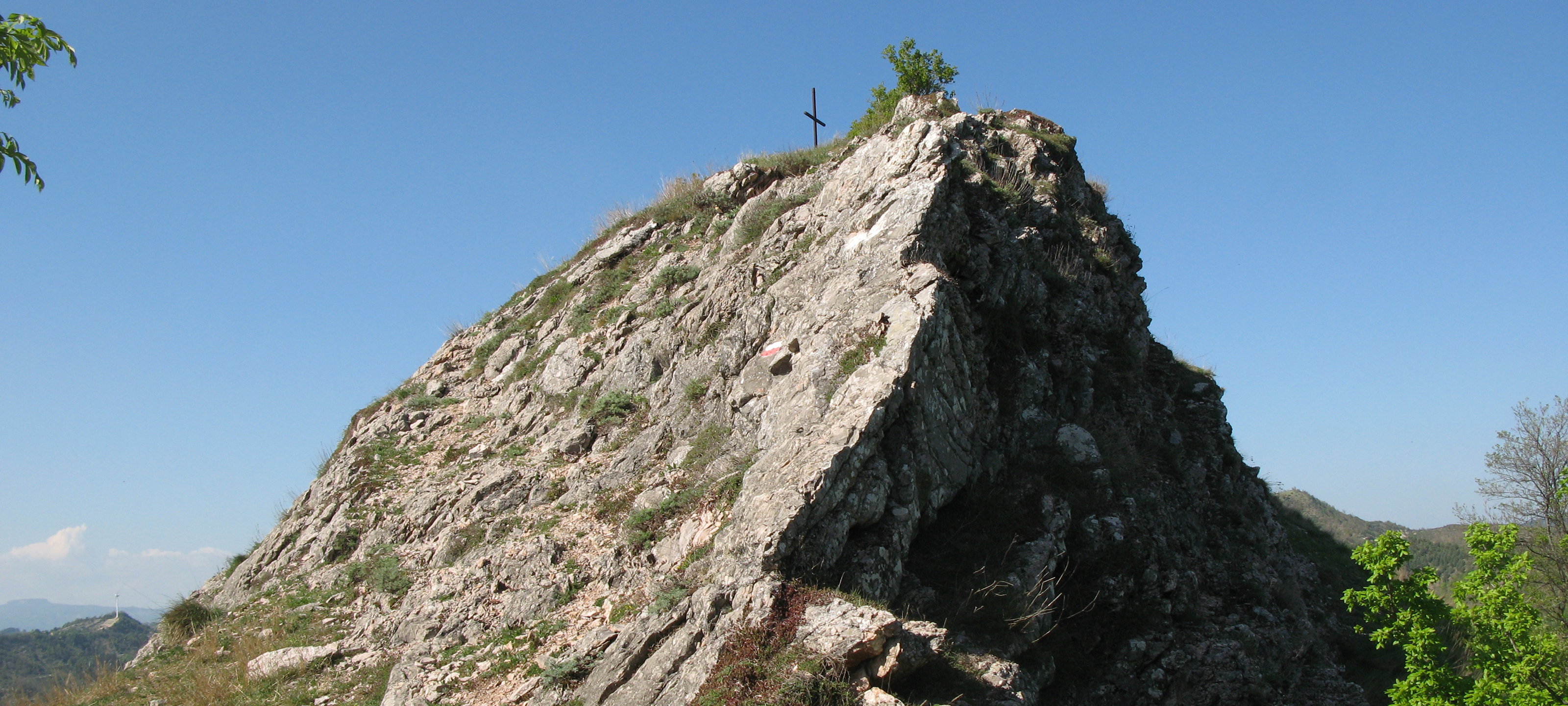 Il tratto in cresta prosegue regolare con la vetta che si fa via via più vicina, lasciando intravedere la croce metallica posta su di essa, fino a giungere ad un passaggio roccioso quasi verticale, dove è obbligatoria una svolta a sinistra, su debole traccia che attraversa un terreno scosceso ed un po’ esposto (fare attenzione a non scivolare, sono presenti ometti di pietra ad indicare la giusta via), necessaria per aggirare l’ostacolo e raggiungere il versante opposto, molto meno ripido, dal quale si può affrontare la salita finale in tutta sicurezza.