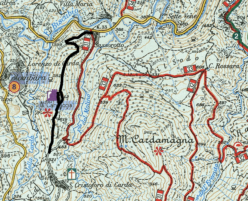 Il sentiero 31bis del Monte Nerone (nella nuova numerazione indicato con il 231b) è un interessante itinerario che conduce alla “Cardaccia”, ovvero ai ruderi dell’antico castello dei Conti Ubaldini di Apecchio, situato su una panoramica vetta che domina le valli del Fosso della Carda e del Fosso del Molino.