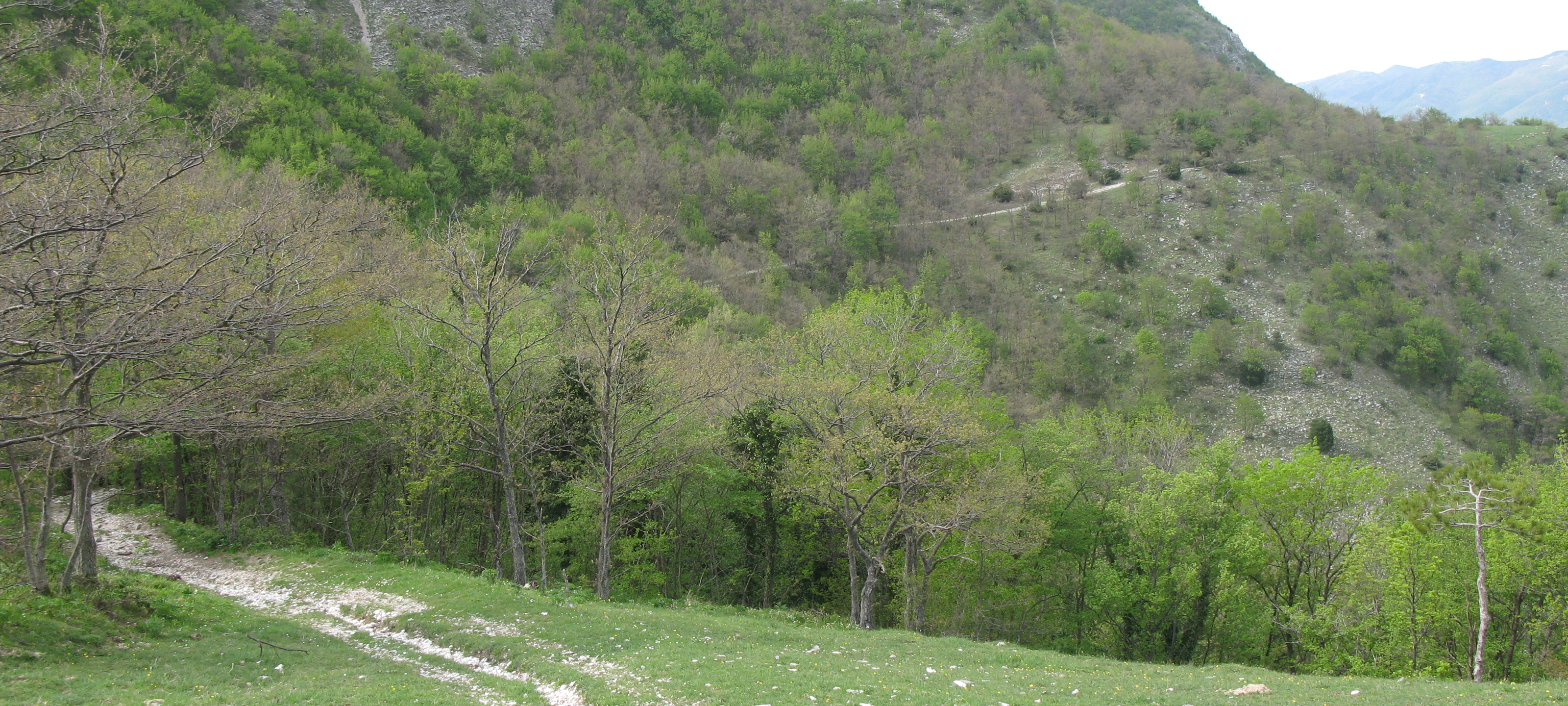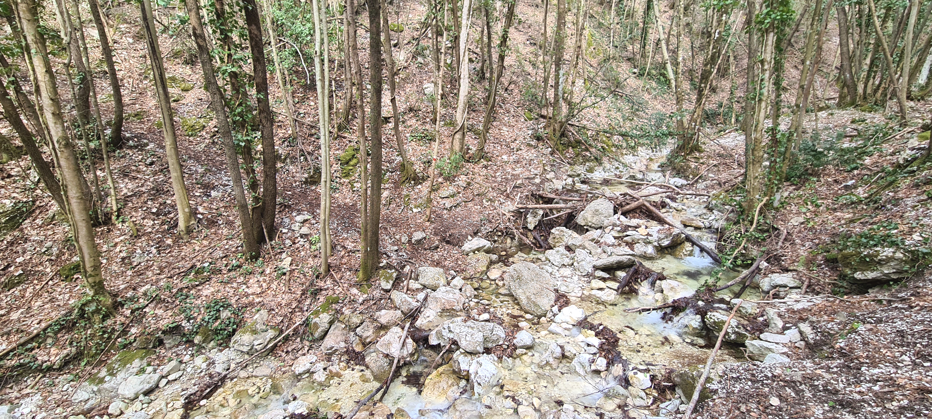 Il sentiero scende quindi nella valle del Fosso dell’Eremita, superando un paio di passaggi panoramici (leggera esposizione) dai quali si può osservare tutta la valle, con le belle cascate del Fosso Pisciarello in alto verso est. La discesa termina con il guado del fosso (non pericoloso ma abbastanza ampio, potrebbe capitare di dover passare nell’acqua), superato il quale ci si ritrova in una zona dalla fitta vegetazione con, per fortuna, una buona segnaletica risistemata di recente che permette di orientarsi e raggiungere la traccia che inizia a salire, con media pendenza, verso il piccolo rilievo che funge da spartiacque tra i fossi dell’Eremita e del Pisciarello.