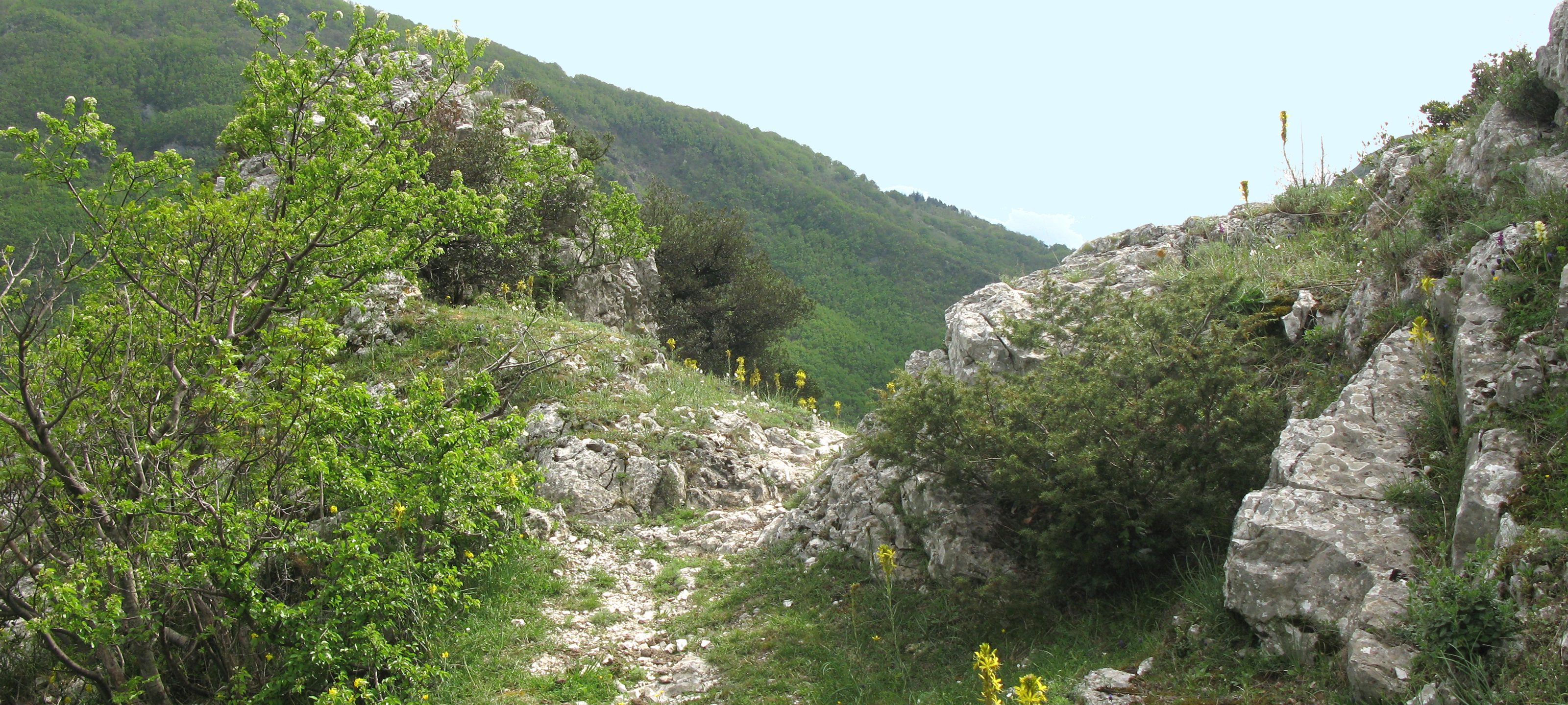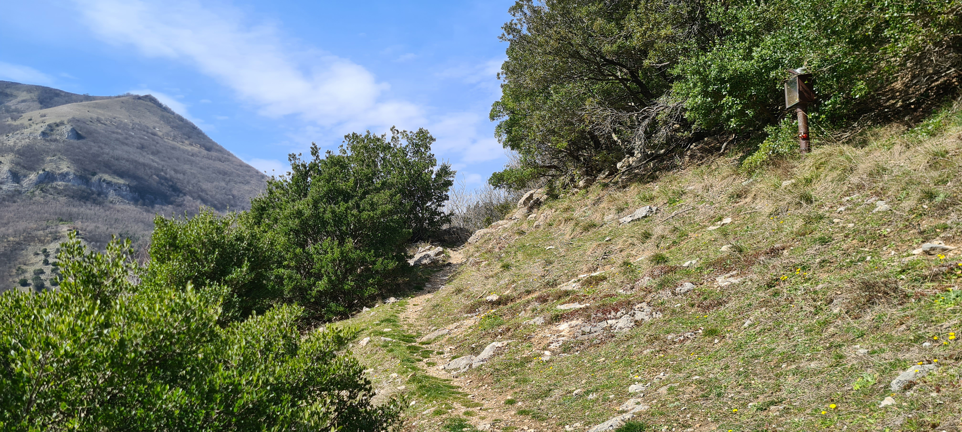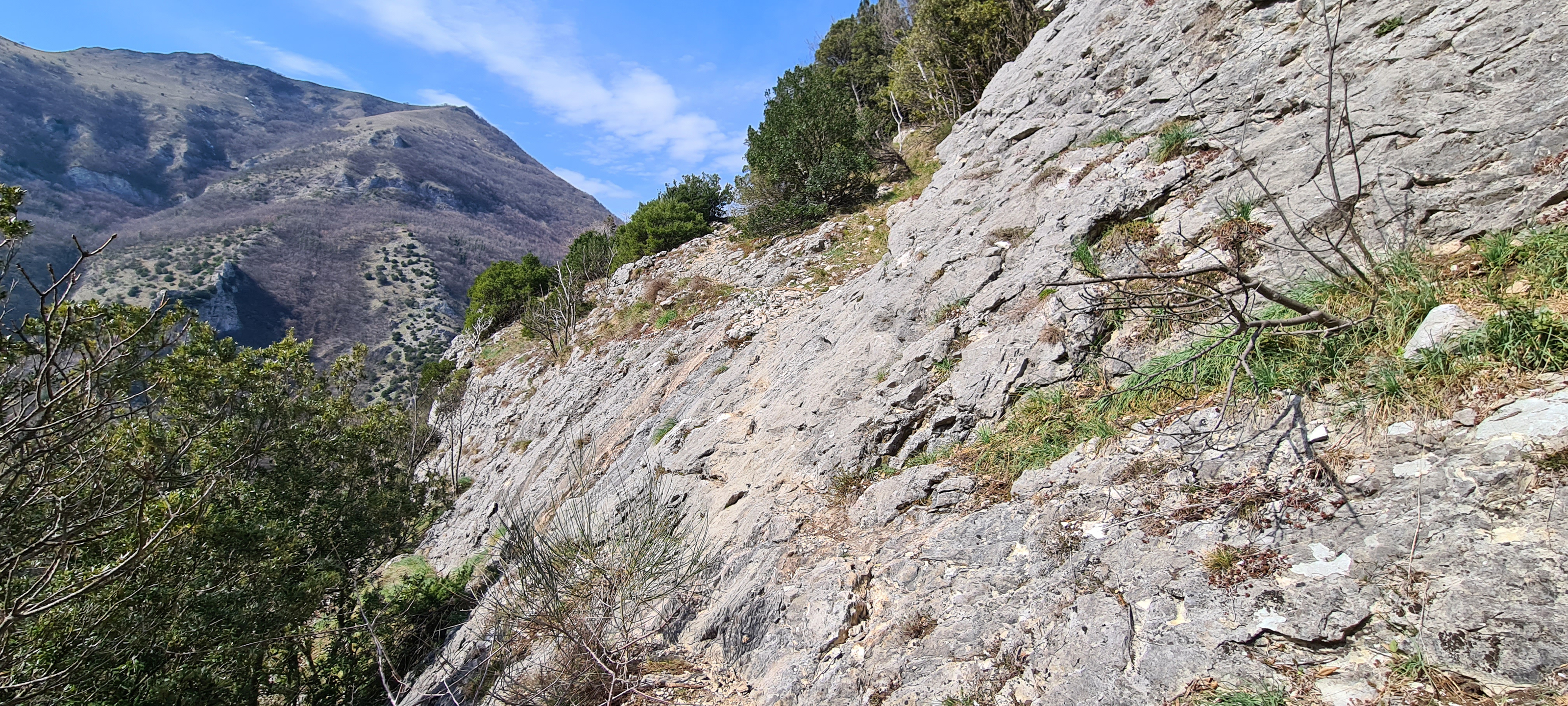 Oltrepassato il guado, il sentiero inizia ora decisamente a salire, attraversando il versante mediante una serie di stretti tornanti (è presente un bivio a sinistra, da ignorare, che conduce all’entrata di una delle tante grotte presenti sul Monte Nerone), fino a raggiungere l’incrocio con il sentiero 30 che sale dalle Porte del Rio Vitoschio, dove il percorso ha termine.