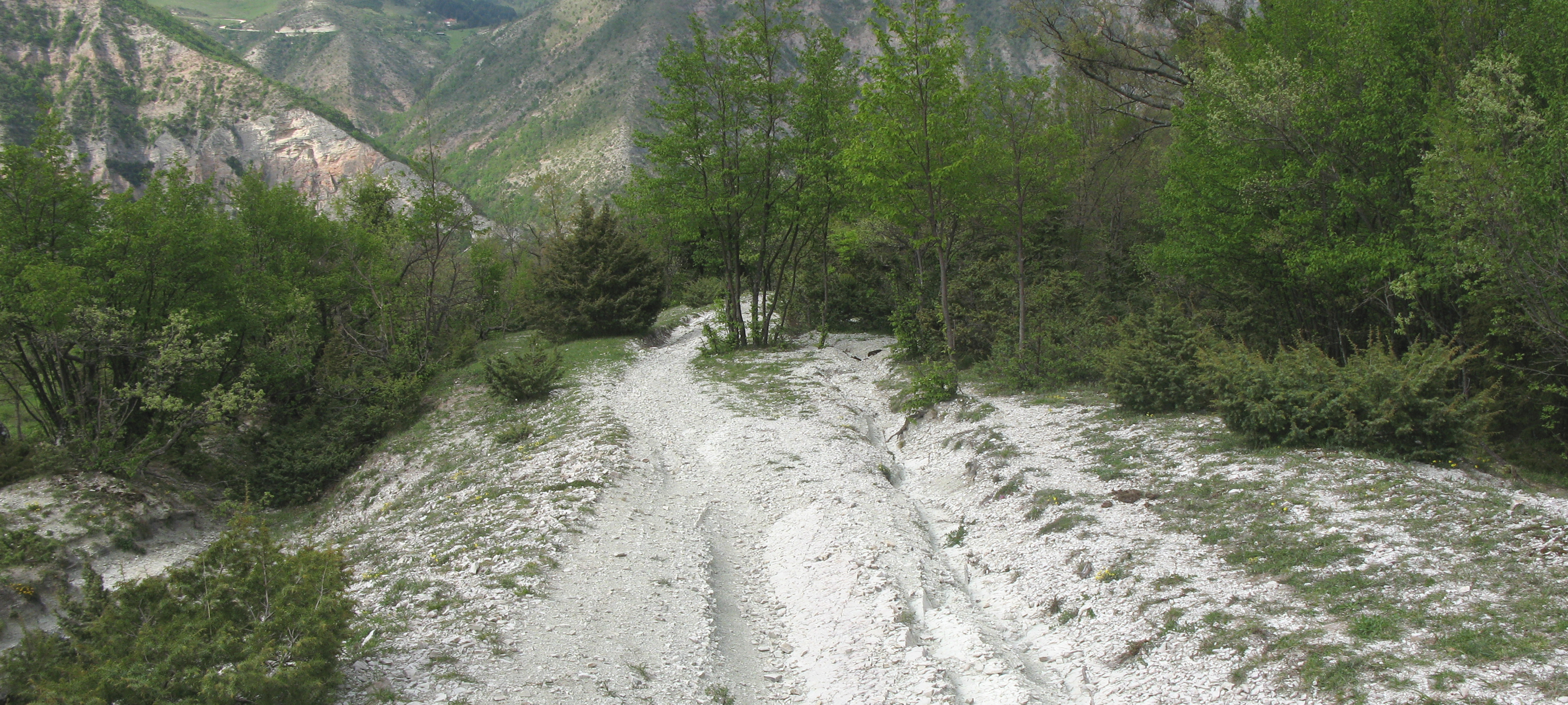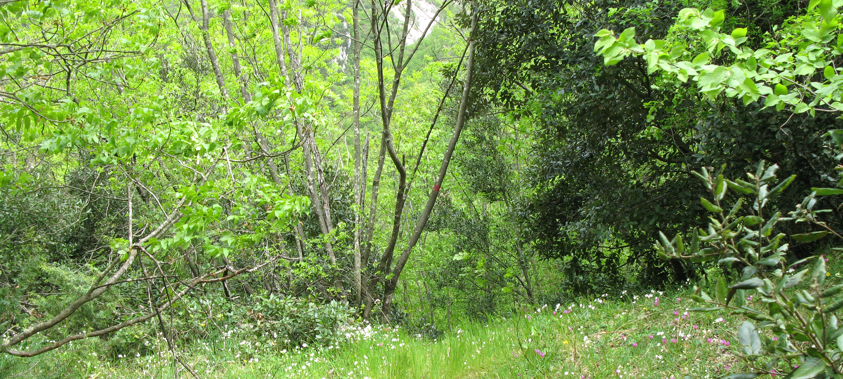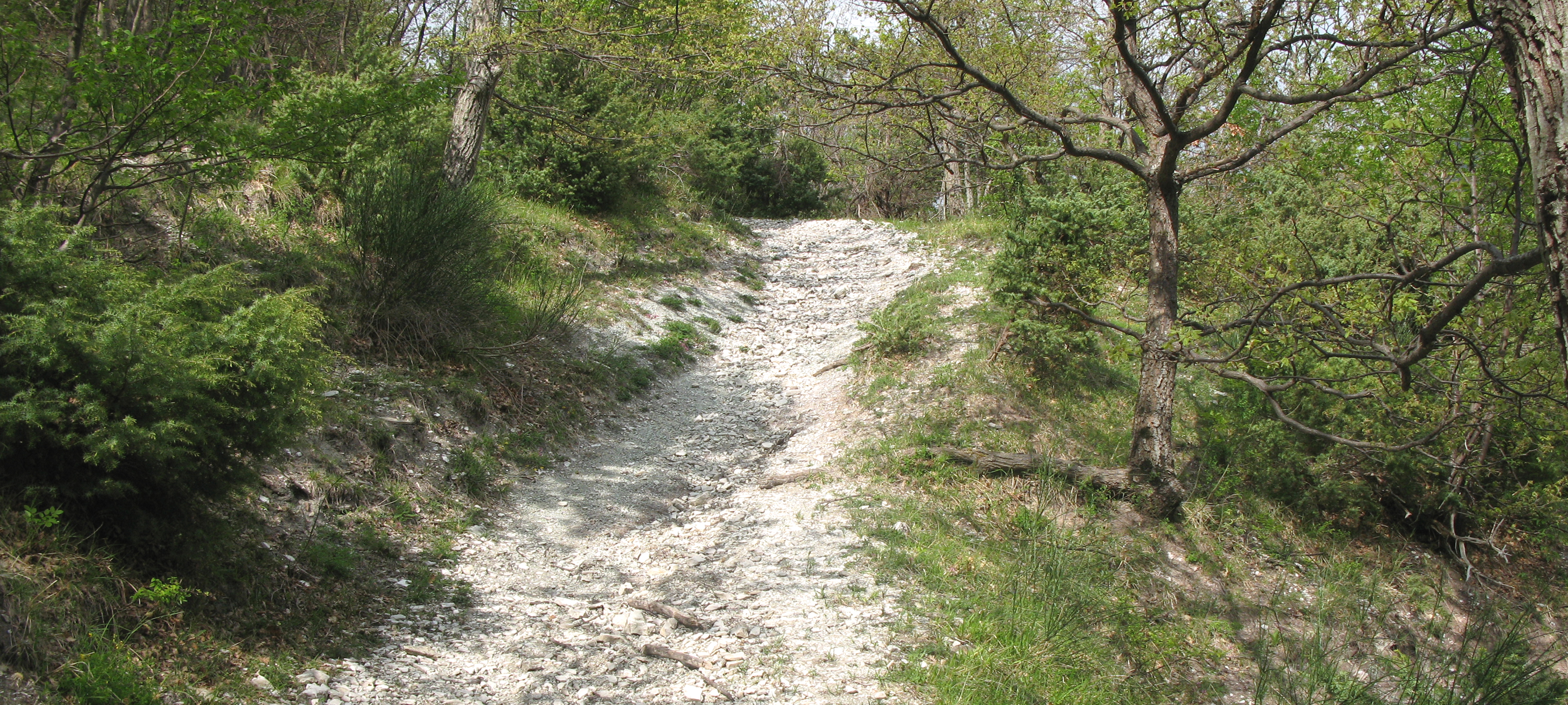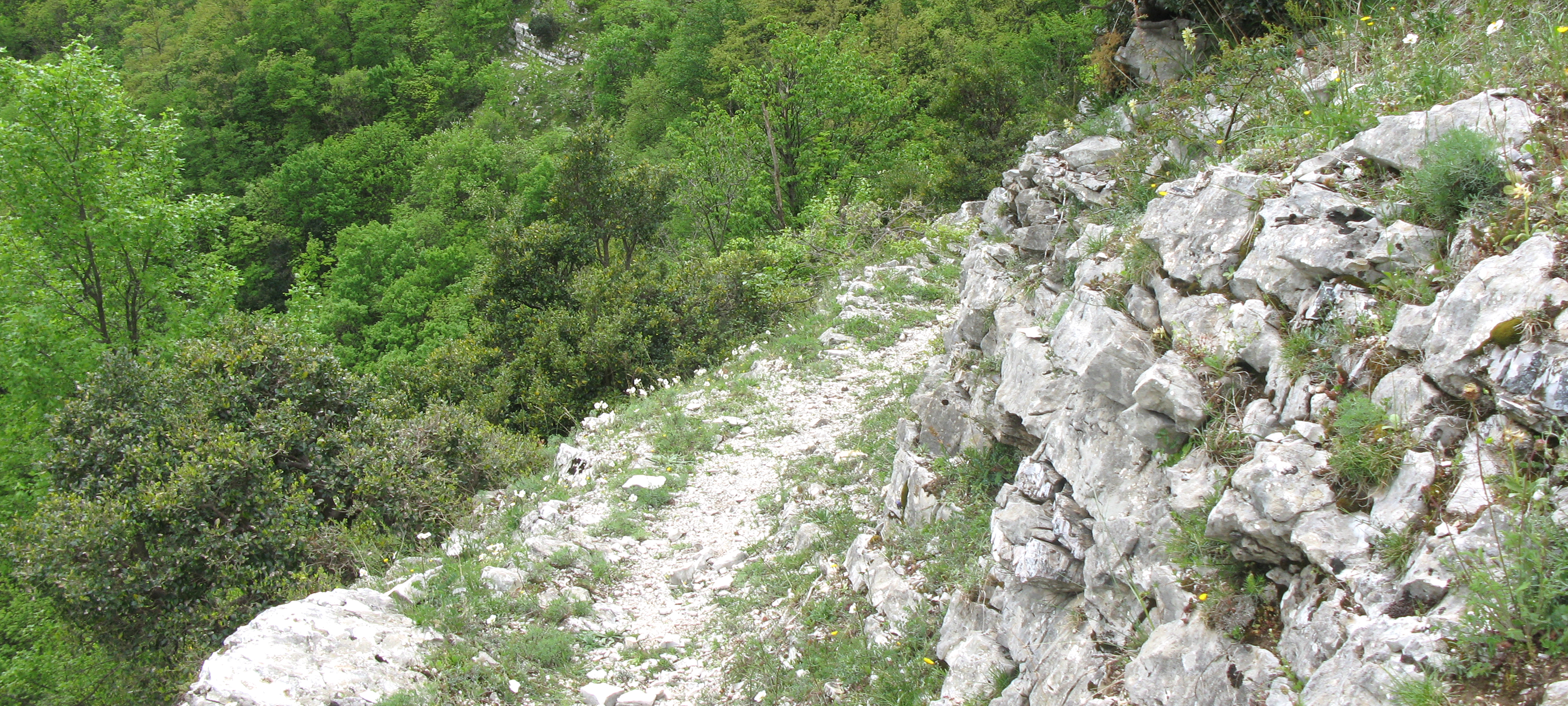 Oltrepassato il guado, il sentiero inizia ora decisamente a salire, attraversando il versante mediante una serie di stretti tornanti (è presente un bivio a sinistra, da ignorare, che conduce all’entrata di una delle tante grotte presenti sul Monte Nerone), fino a raggiungere l’incrocio con il sentiero 30 che sale dalle Porte del Rio Vitoschio, dove il percorso ha termine.