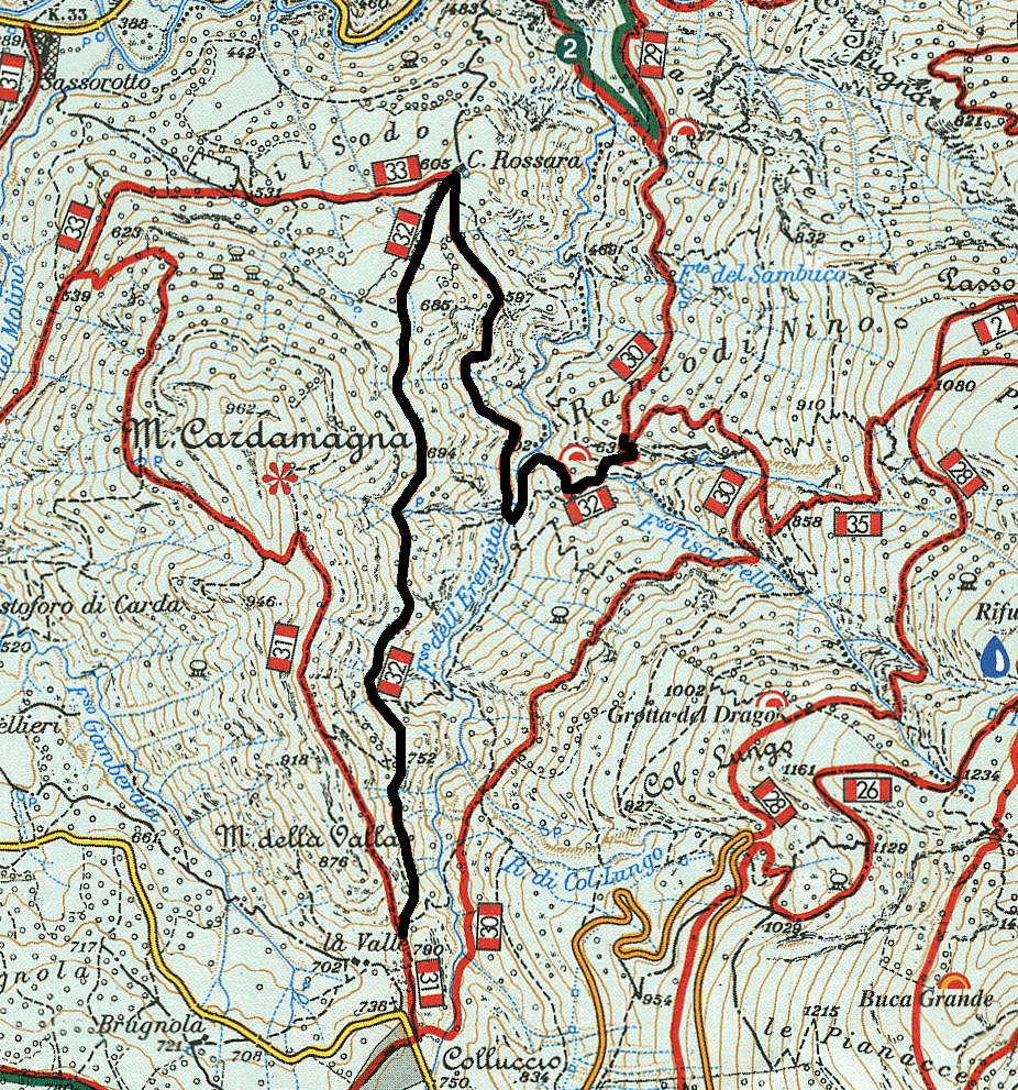 Il sentiero 32 inizia in località Colluccio, staccandosi con una svolta a destra dal 31, proprio prima che quest’ultimo inizi la sua lenta ascesa verso la cresta del Cardamagna.