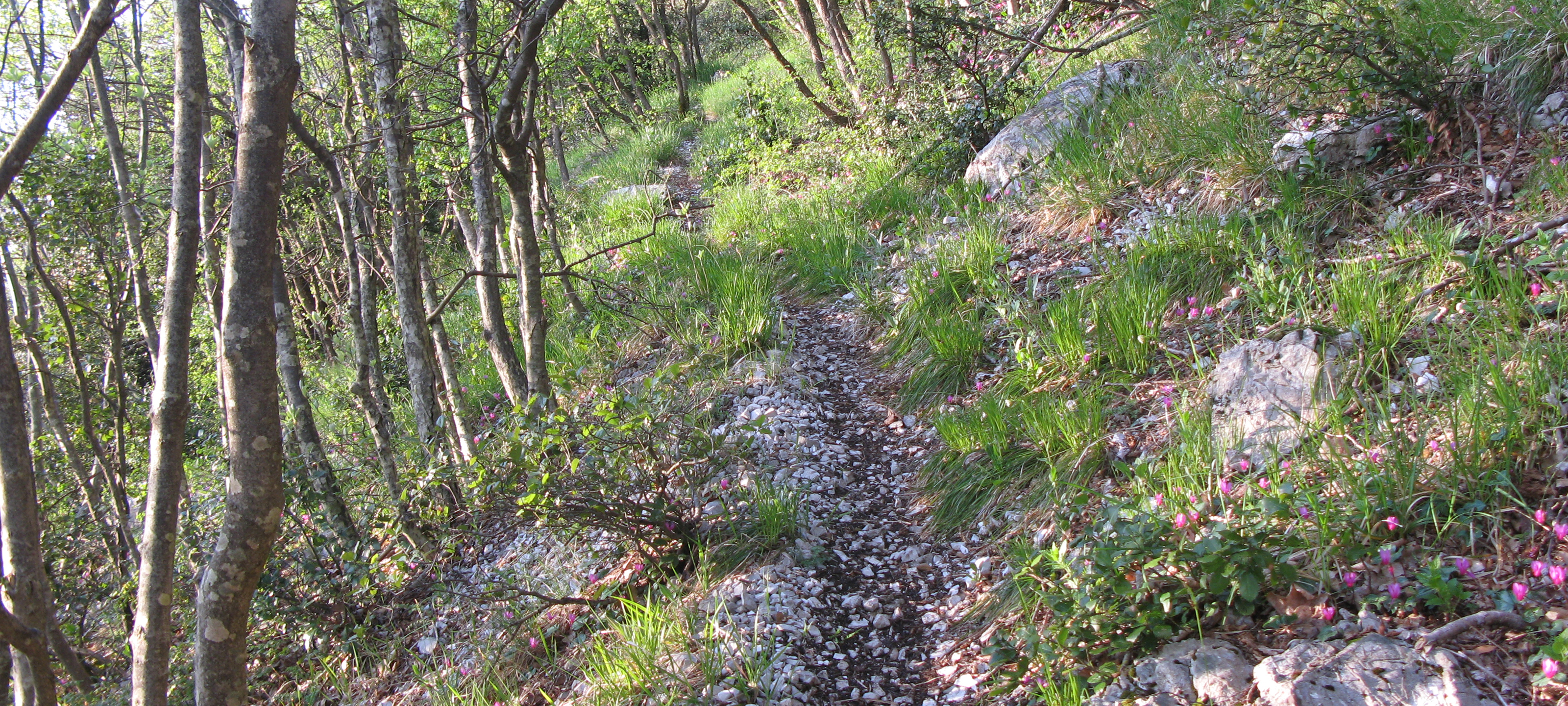 Dopo numerose svolte tra gli alberi, si esce sull'ampio Prato del Conte dove si incontra l'evidente traccia del sentiero 2 (segno dell'incrocio su di un palo con frecce direzionali recentemente installato), termine del tratto (in questo punto converge anche il sentiero 28 che scende dall'alta valle del Pisciarello).
