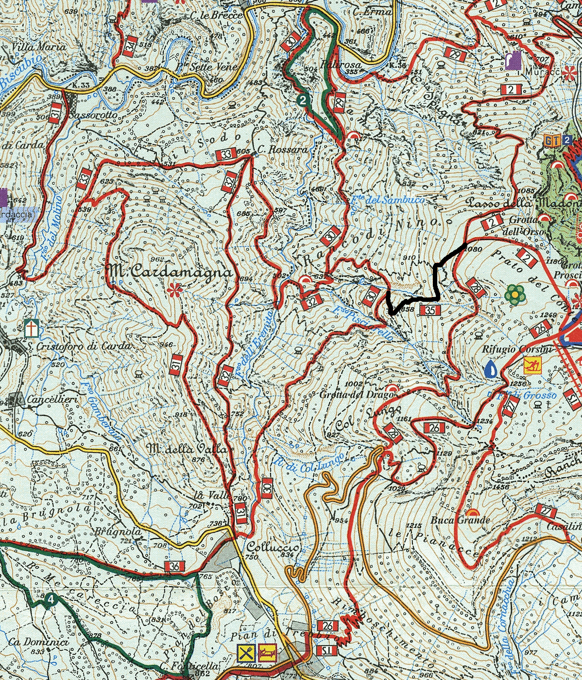L'incrocio è molto facile da individuare percorrendo il sentiero in salita, mentre se ci si trova in discesa occorre prestare più attenzione, giacchè nella parte finale la traccia del 35 si fa incerta ed è necessario trovare il segno sul primo albero (qualche decina di metri più in basso) che risulta essere un po' sbiadito.