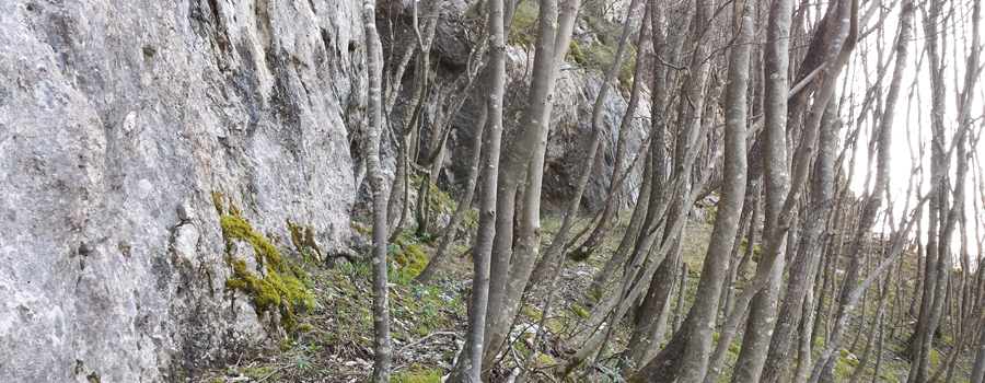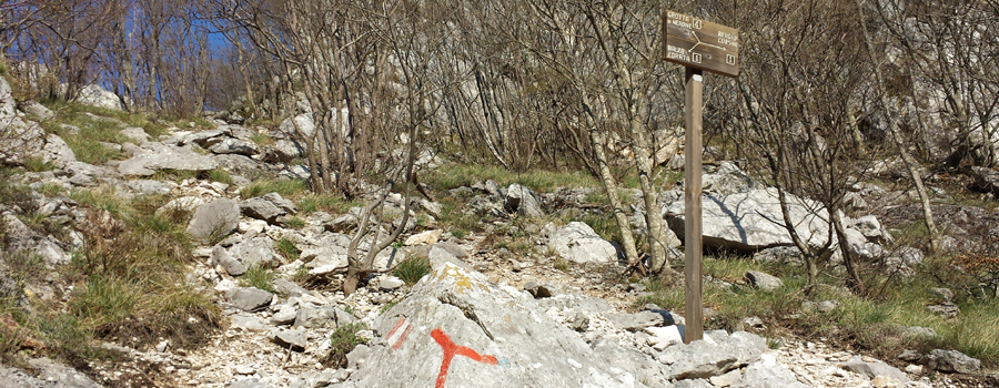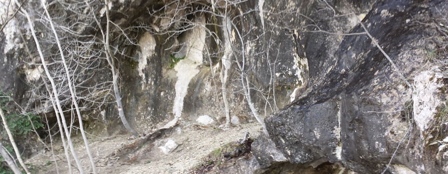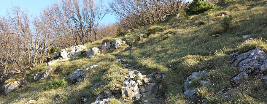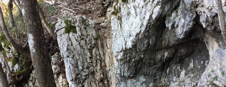 Superato il ripido tratto, si costeggia la parete seguendo la segnatura presente, fino a raggiungere un passaggio su placca verticale, alta circa 3 metri, sulla quale è stata posta una corda per facilitarne il superamento (la roccia è solida e fornisce diversi appigli, occorre cautela ma è affrontabile).