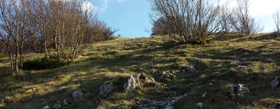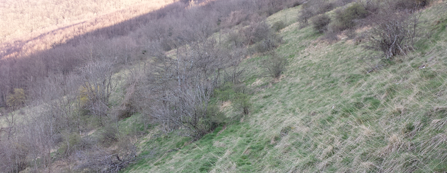 Il sentiero prosegue con pendenze ora decisamente più agevoli, superando l’accesso alla Grotta di Nerone, attraversando quindi il grande prato dei Ranchi, ed incontrando infine la strada asfaltata che, partendo da Piobbico sale in vetta al Nerone.