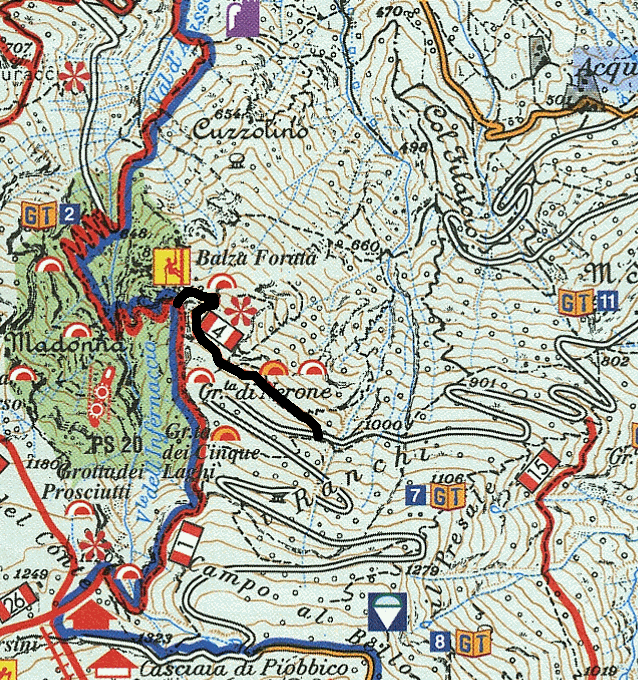 Il punto di partenza è situato sul sentiero 1, con un bivio ben segnalato posto subito dopo la Balza Forata, nel quale occorre imboccare la traccia di sinistra (a destra si prosegue sull’1 verso il Rifugio Corsini). L’ambiente è particolarmente selvaggio ed impervio, il terreno sconnesso e le pendenze si fanno importanti fin dai primi passi. Percorsi pochi metri si raggiunge il vertice della maestosa parete rocciosa che delimita la Gola dell’Infernaccio, che si affronta aggirandone il versante a strapiombo e salendo su di un canalino (sono presenti passaggi in cui è necessario aiutarsi con le mani).