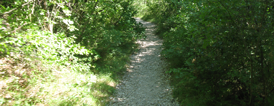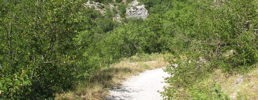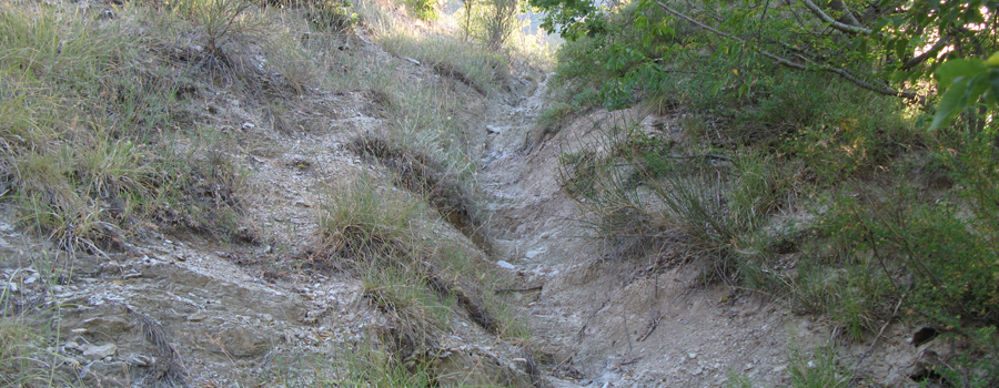 Oltrepassato il fosso per l'ultima volta, il percorso se ne stacca ora nettamente, iniziando una risalita più ripida sul fianco della montagna, in ambiente caratterizzato da ginepri ed arbusti vari, con fondo in terra un po' friabile. La salita è comunque abbastanza breve, non più di 120 metri di dislivello e la traccia è ben individuabile e comoda da seguire.
