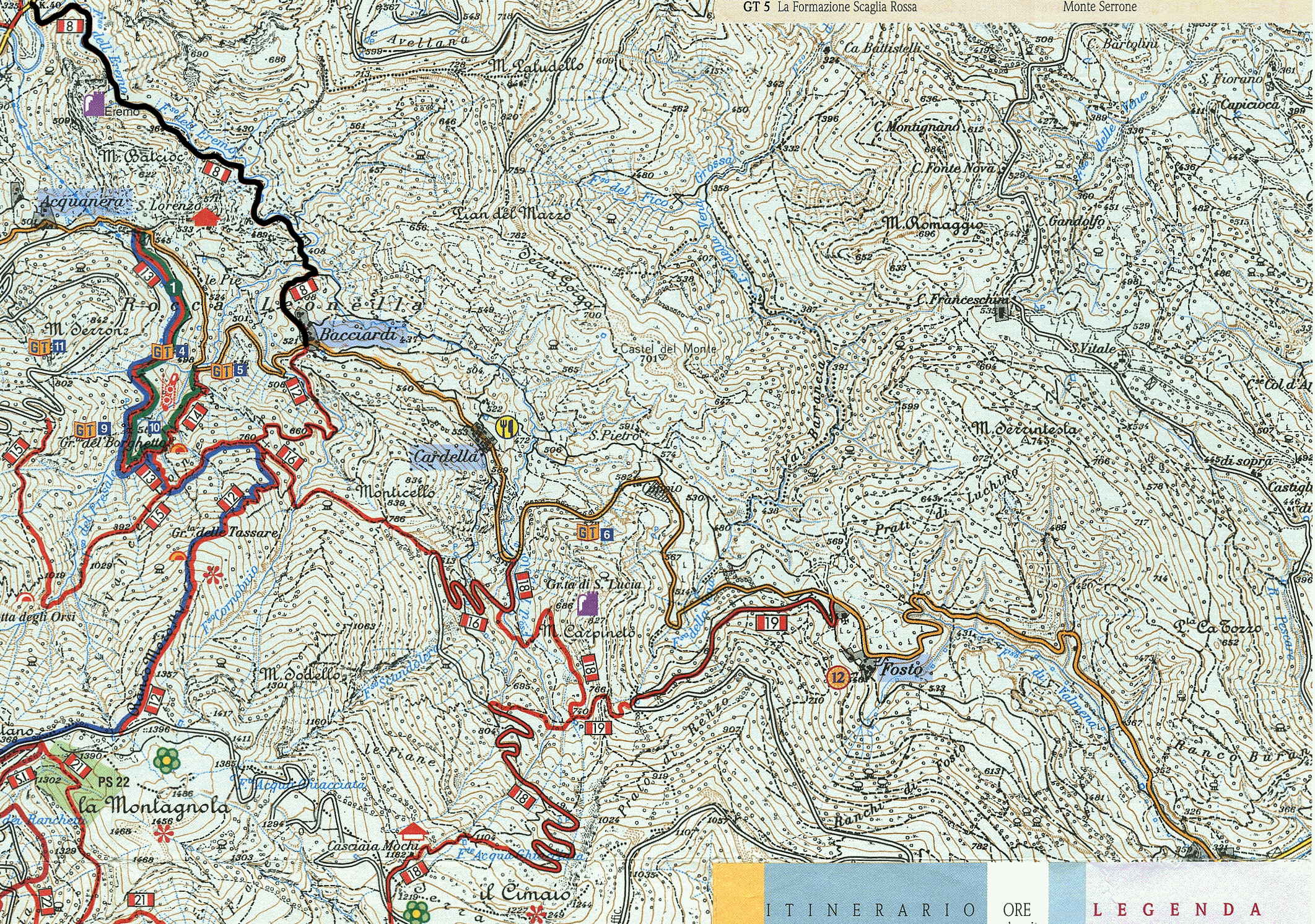 Al termine della stessa si iniziano ad incontrare le prime case, e si raggiunge quindi l'abitato di Bacciardi, grazioso paesino arroccato sulle pendici settentrionali del Nerone, dove termina il tracciato (quota 521 metri). Attraversato il paese si incontrano i segni per il sentiero 12, naturale proseguimento dell'8 (i due sentieri sono stati uniti nella nuova numerazione e sono stati entrambi contrassegnati con il numero 208), che conduce alla cima della Montagnola.