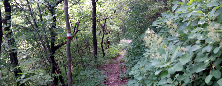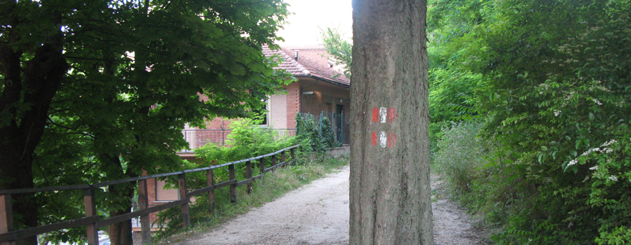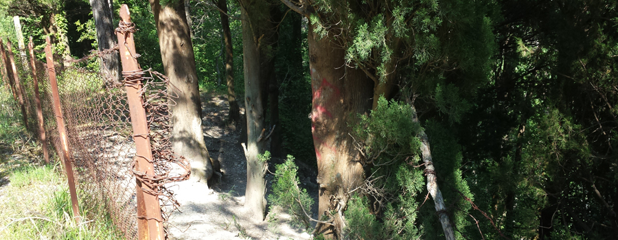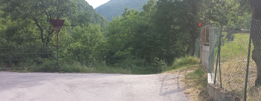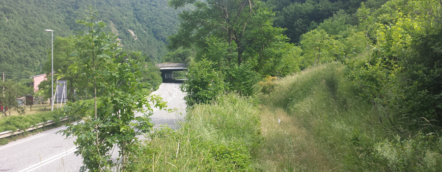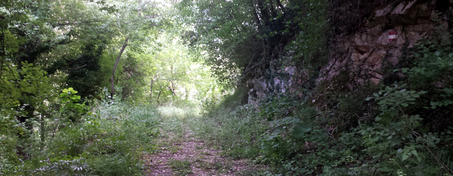 Si percorre, quindi, un breve tratto su asfaltata attraversando un nuovo sottopassaggio e quindi percorrendo per pochi metri il vecchio e oramai dismesso tratto della strada Flaminia (in direzione Cagli), giungendo ad uno spiazzo dal quale parte, ben segnalato, un nuovo tratto di sentiero che sale a zig-zag nel bosco con una pendenza piuttosto marcata.