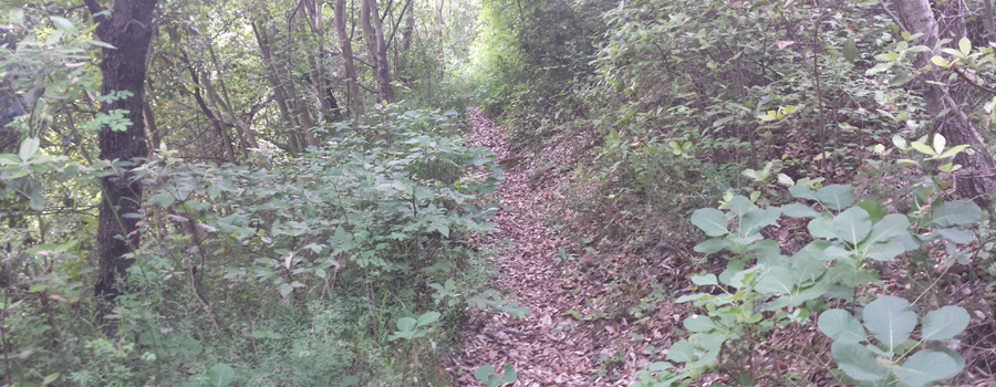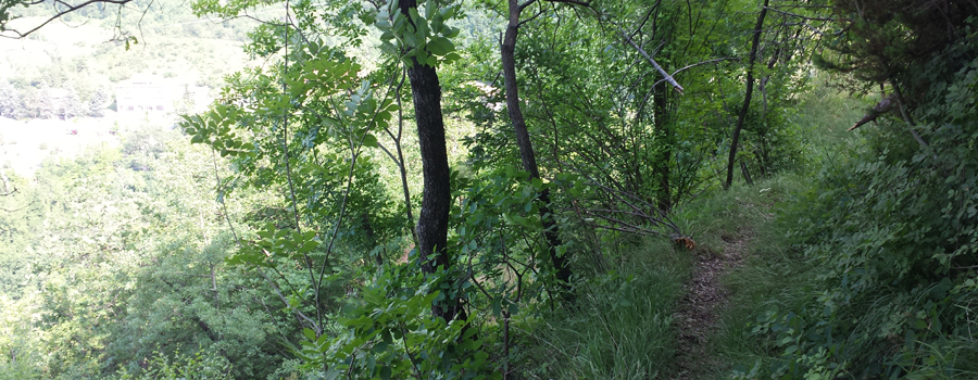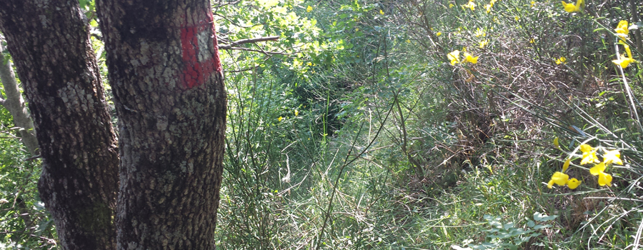 Nel tratto successivo il sentiero versa in discrete condizioni, la traccia è abbastanza visibile e sono presenti alcuni segni seppur piuttosto datati, e si può proseguire agevolmente in falsopiano, con brevi saliscendi, per circa un paio di chilometri, fino a costeggiare la Flaminia e giungere quindi, dopo aver attraversato un sottovia, nella piccola frazione di Foci.
