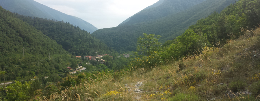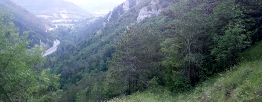 Da questo punto il percorso inizia a prendere gradualmente quota, alternando tratti in cui si sviluppa all'ombra del bosco e supera alcuni impluvi di fossi che scendono dal Petrano a passaggi in cui l'ambiente si apre decisamente, permettendo di ammirare il bel panorama della valle del Burano in tutta la sua estensione.