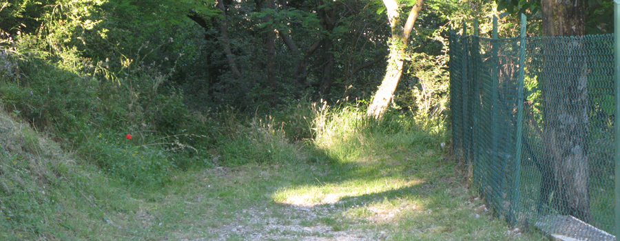 L’uscita sul prato (1050 metri) avviene in corrispondenza di una traccia ben definita in leggera salita che, dopo una svolta secca a destra, termina in corrispondenza di una stradina sbrecciata che fiancheggia alcune villette estive.