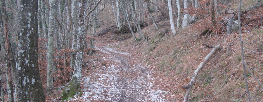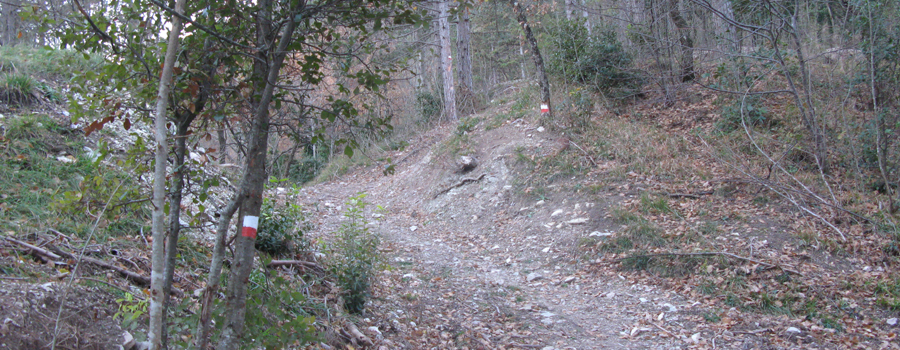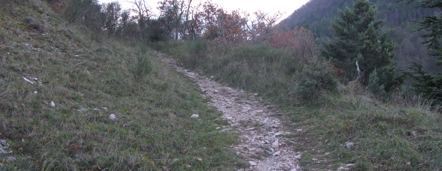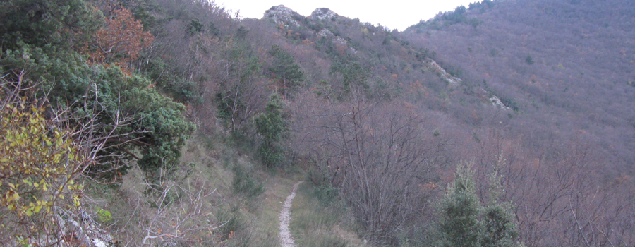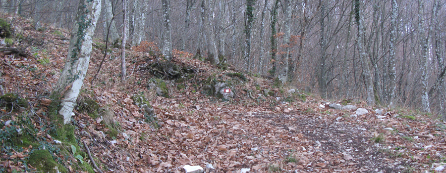 Il tratto si conclude con l’uscita dal bosco su un ampio prato che si stende ai lati del sentiero, per poi rientrare nel bosco fino a giungere dopo poche centinaia di metri ad una seconda sella ai piedi della Serra Ventosa (795 metri).