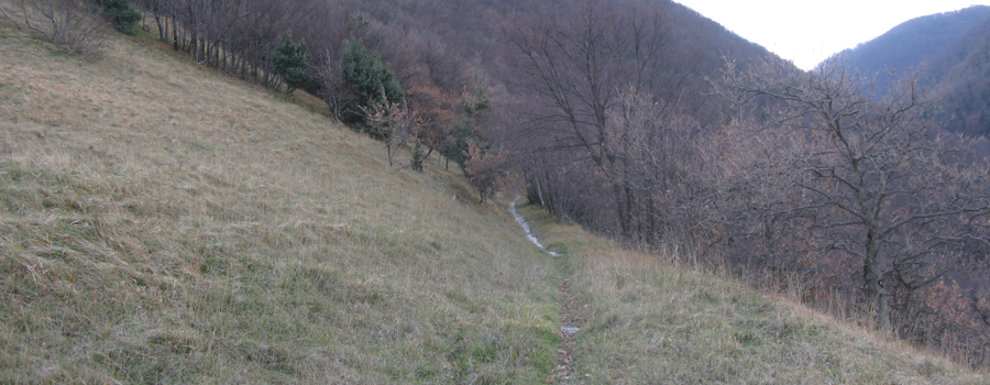 Da questo punto in avanti il sentiero prende a salire in maniera piuttosto decisa con un susseguirsi di svolte all’interno del bosco, incontrando fino all’uscita sui prati sommitali un unico bivio, peraltro ben segnalato, in corrispondenza del quale occorrerà prendere il sentiero verso destra.