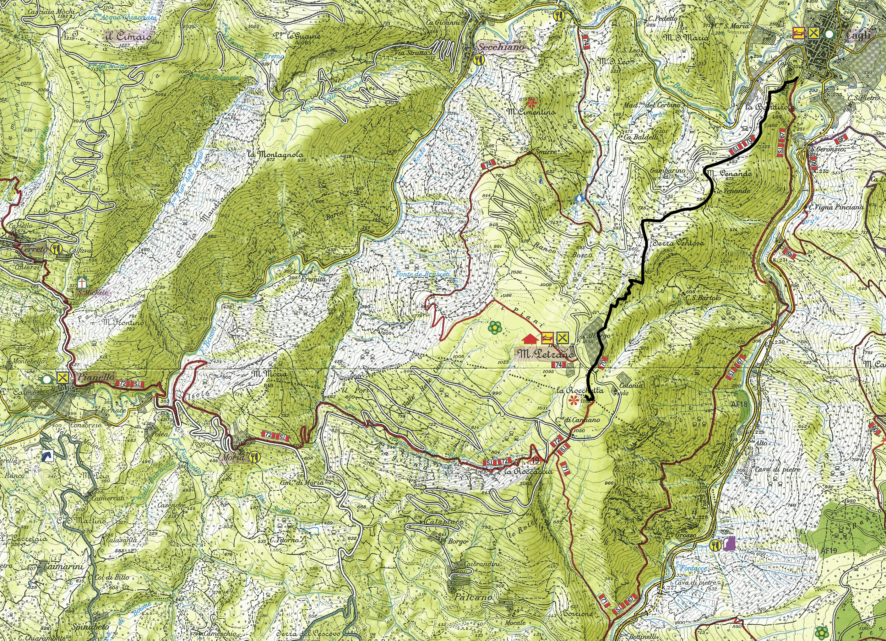 Dal centro di Cagli si imbocca la strada per il Monte Petrano, raggiunto il primo tornante si parcheggia la macchina (parcheggio comodo 20 metri dopo il tornante stesso) e si imbocca il sentiero ben segnalato nei pressi di una edicola.