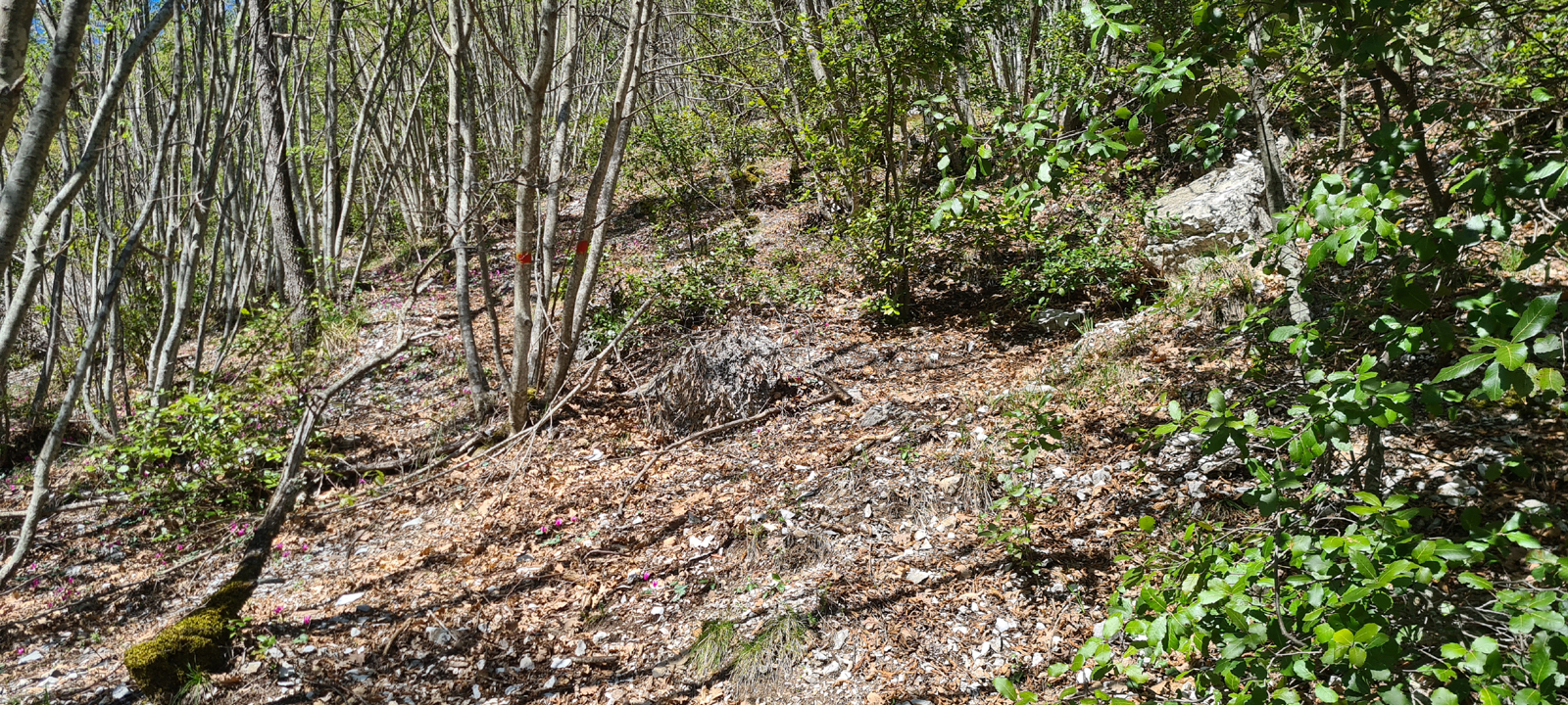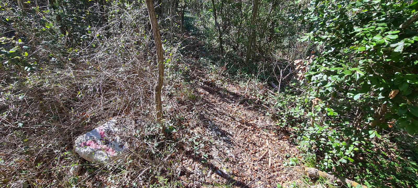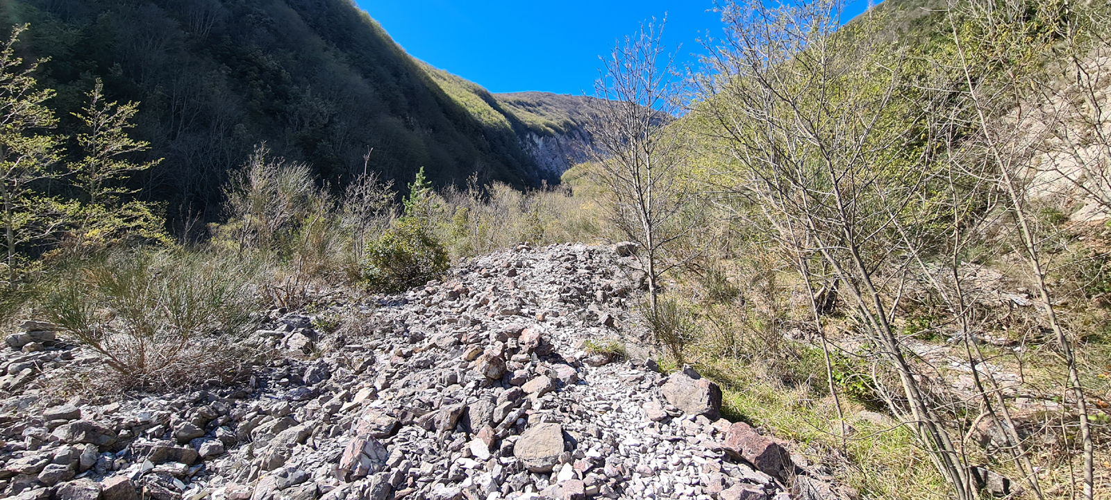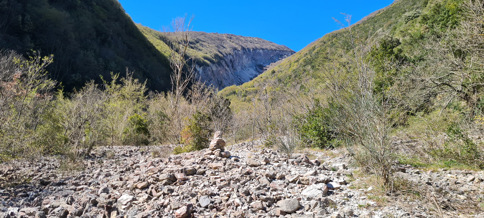 Il percorso prosegue risalendo inizialmente il suddetto letto, con un fondo pietroso e sconnesso, dove non è raro imbattersi in serpentelli di vario tipo (attenzione alle vipere!), con la via da percorrere segnalata da alcuni ometti di pietra che indicano che, nonostante le condizioni di generale abbandono, qualcuno ancora affronta questo sentiero...
