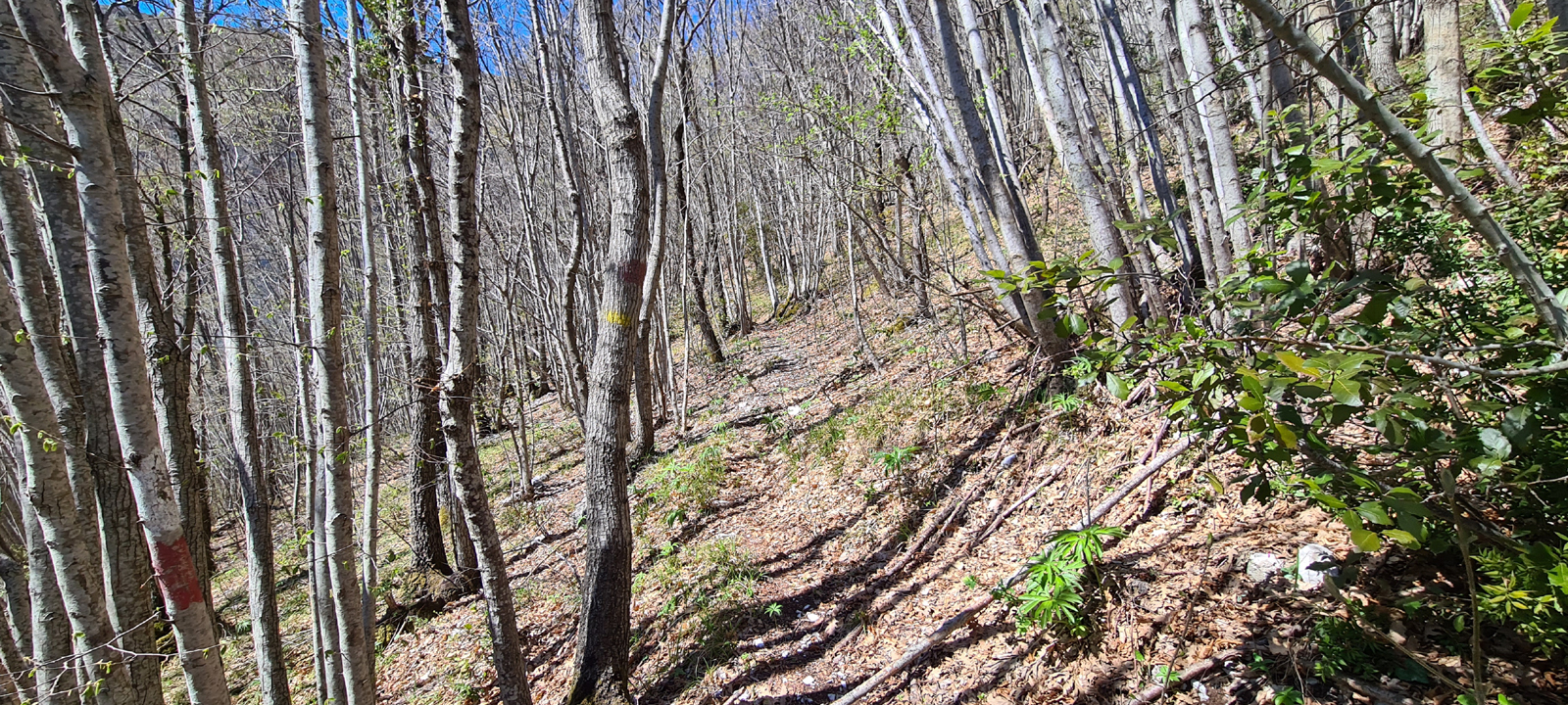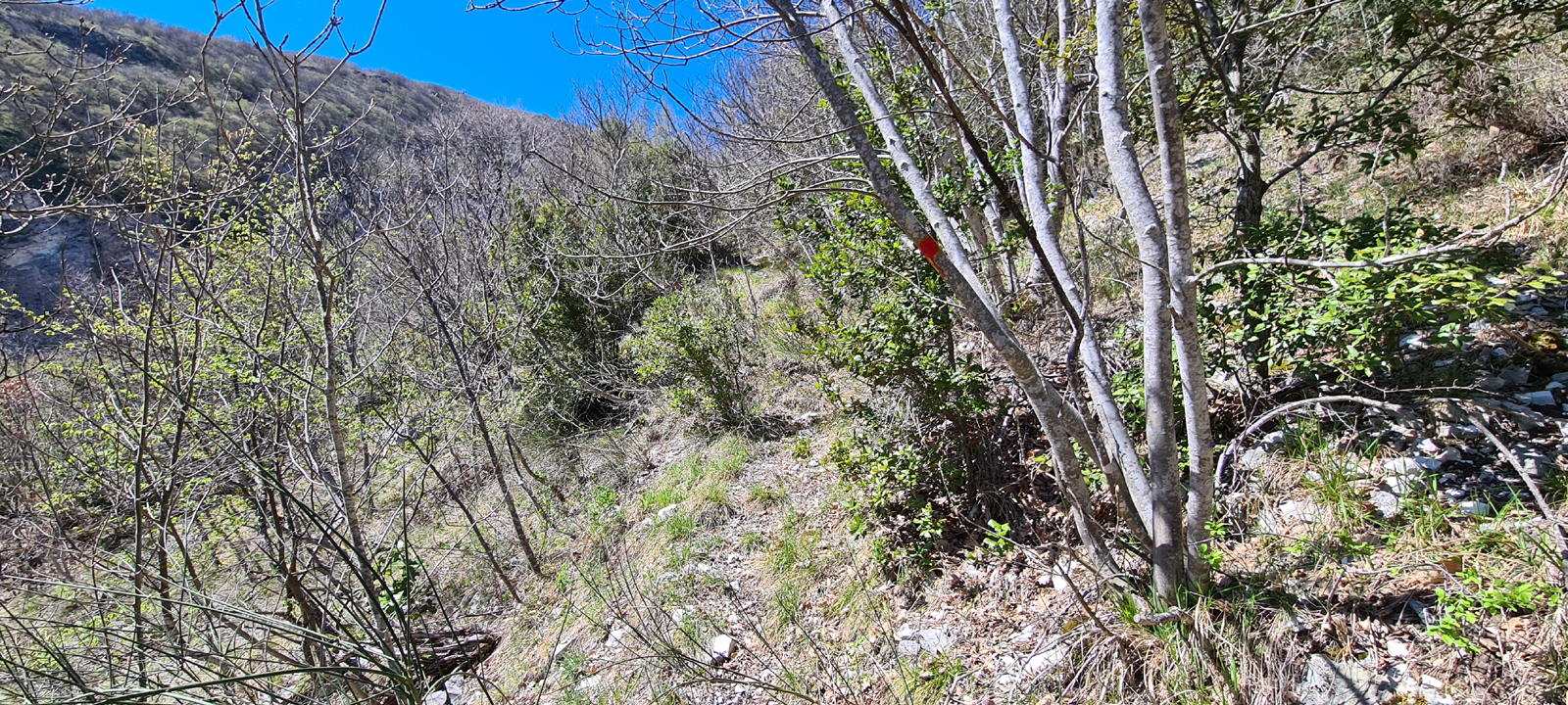 Qualche problema ulteriore inizia nel momento in cui si abbandona il torrente, svoltando verso destra (segno molto sbiadito) ed immergendosi nel bosco sovrastante, in quanto la traccia è difficile da individuare e l'ambiente è tutto uniforme, un bosco abbastanza fitto intervallato da alcuni passaggi su ghiaioni (ce ne sono una decina, almeno) che risultano all'apparenza tutti uguali, rendendo difficile capire in che punto ci si trovi... La segnatura originale è oramai quasi inesistente (al sentiero non è stata assegnata la nuova numerazione, segno che è praticamente dismesso almeno ufficialmente), limitata ad alcuni vecchi segni bianchi e rossi su degli alberi, ma in aiuto all'orientamento giunge una segnatura non ufficiale più recente, composta da alcuni segni rossi ed altri gialli, probabilmente realizzata da appassionati. In questo tratto la pendenza si fa veramente importante, cosa che unita al fitto sottobosco che è sicuramente d'intralcio rende veramente ostica la prosecuzione.