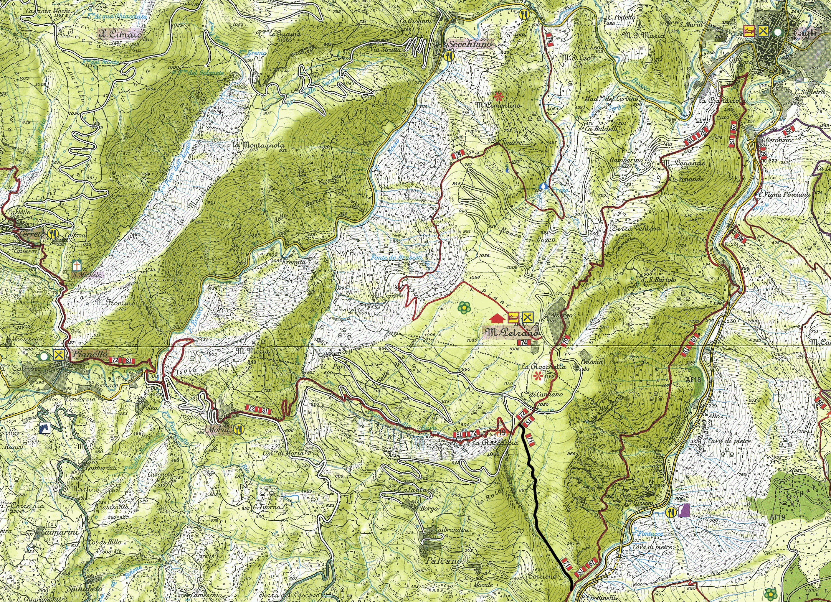 Infatti da questo punto si incrocia un altro tratto del Sentiero Italia (n. 72) che sale da Moria, e che prosegue verso la vetta del Petrano, mentre verso sinistra continuano, in una vecchia carrareccia proveniente da Palcano che aggira tutto il versante della Roccaccia, altri segni bianchi e rossi recanti il numero 71, che seguono la strada fino ad una curva a destra per poi indicare un ripidissimo pascolo in discesa, praticamente parallelo alla via percorsa in salita, segni che si trovano in una zona dove sulla cartina non ci sono sentieri....