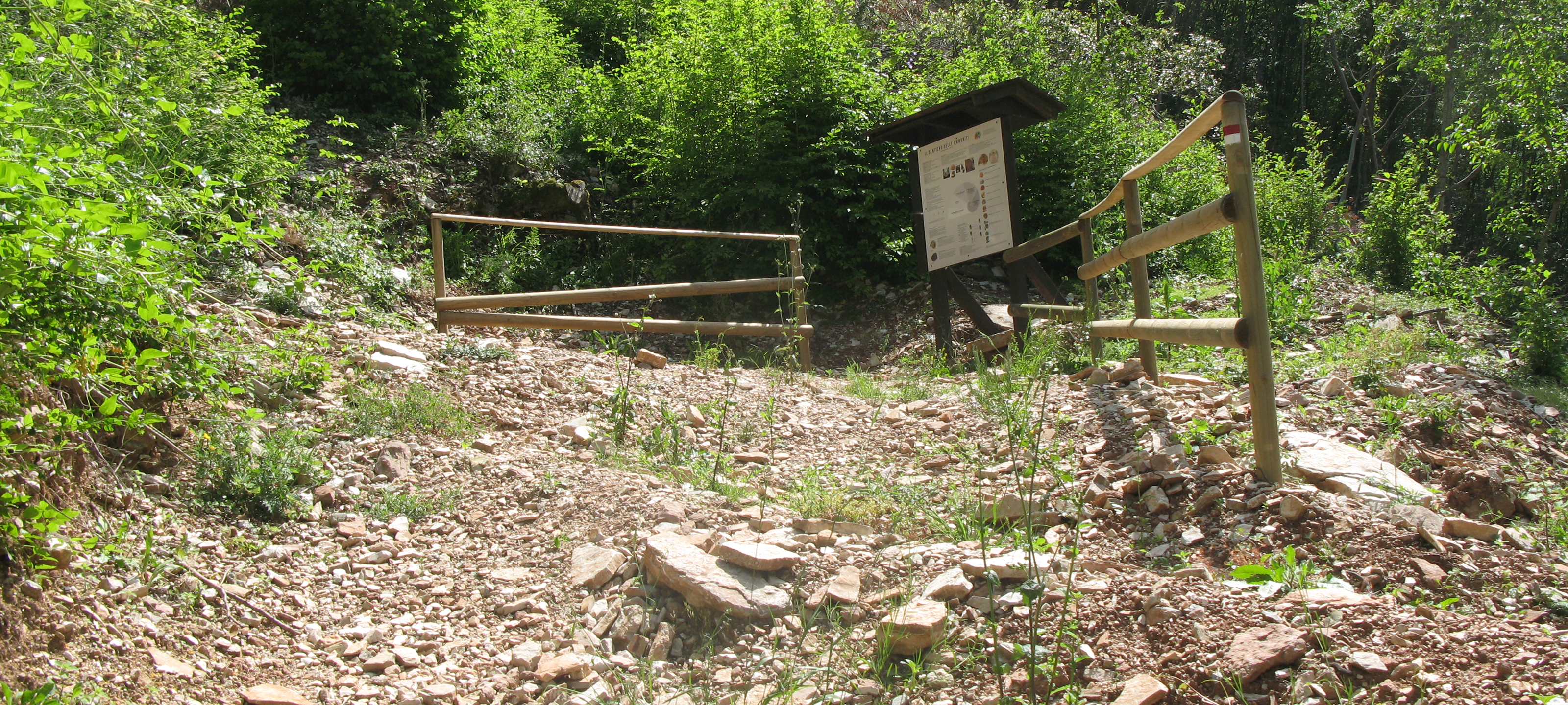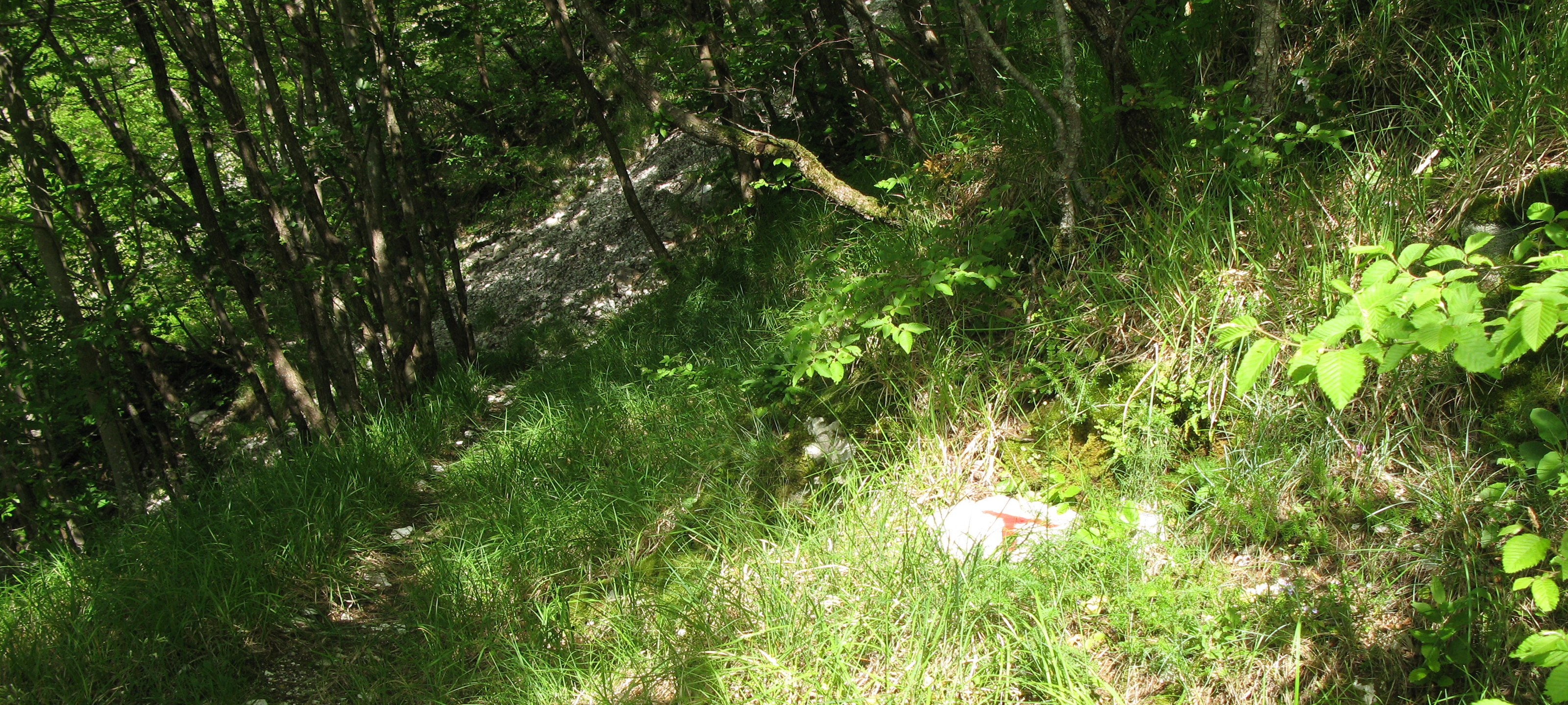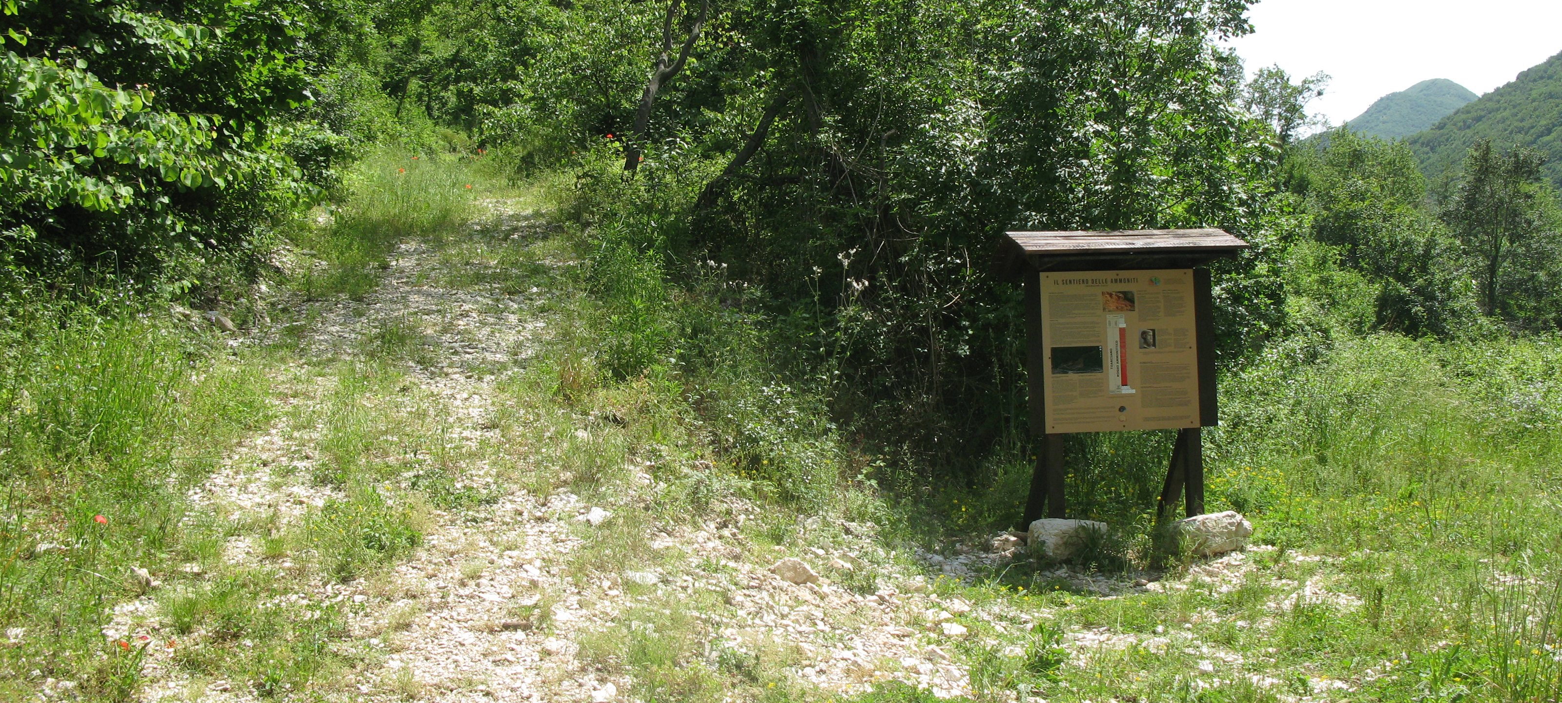 Come già accennato la parte iniziale è molto dura, si sale in ambiente abbastanza scoperto, su una larga pista sassosa che si inerpica sul fianco occidentale della montagna, accompagnati dai frequenti pannelli illustrativi che permettono agli escursionisti di approfondire la conoscenza delle ammoniti, fossili risalenti a milioni di anni fa, quando il terreno di quelle che oggi sono le belle montagne appenniniche si trovava sul fondo del mare. Se si è fortunati ed attenti, è possibile rinvenire qualche traccia di questi interessanti reperti lungo il tracciato, soprattutto in terra o nella formazione chiamata “rosso ammonitico”, che si incontra lungo la salita, ben riconoscibile a causa del suo colore.