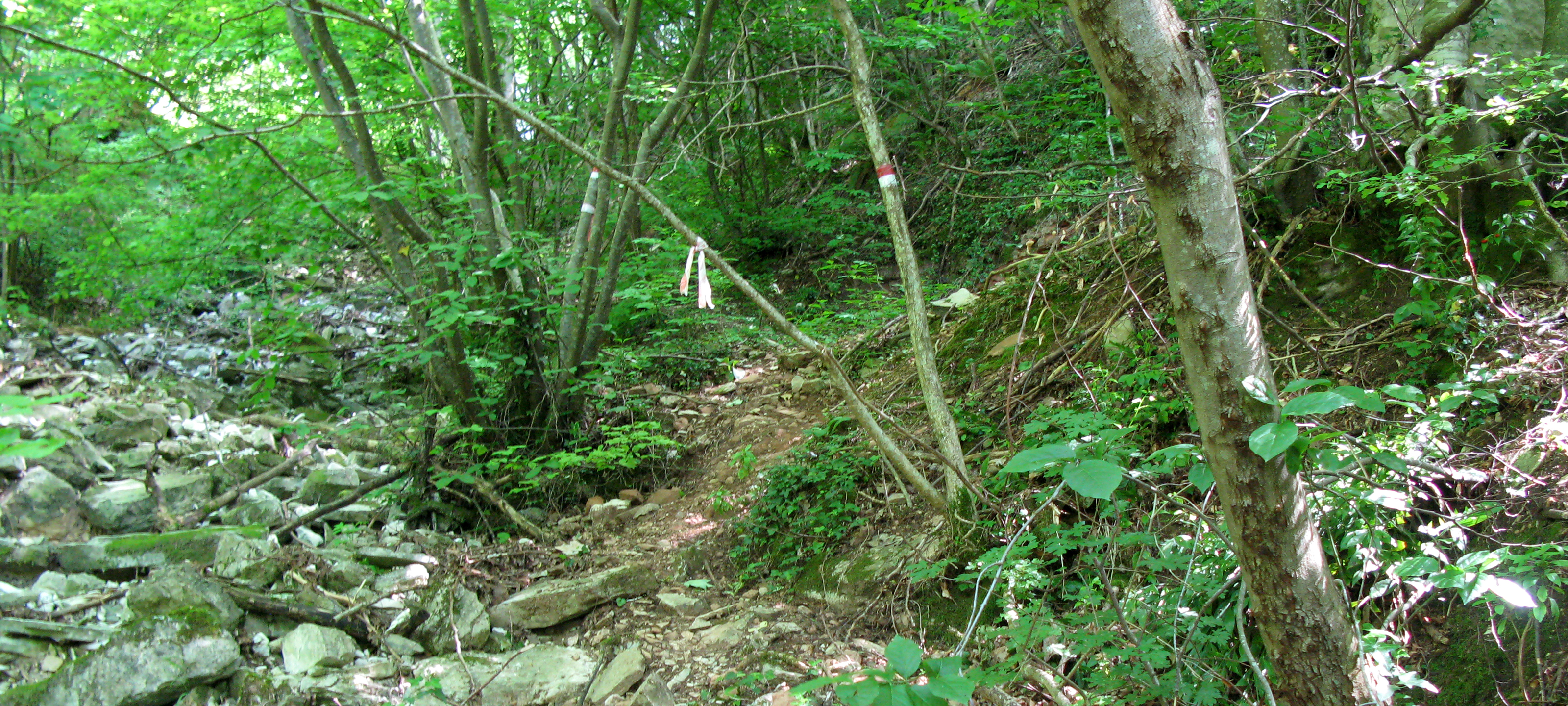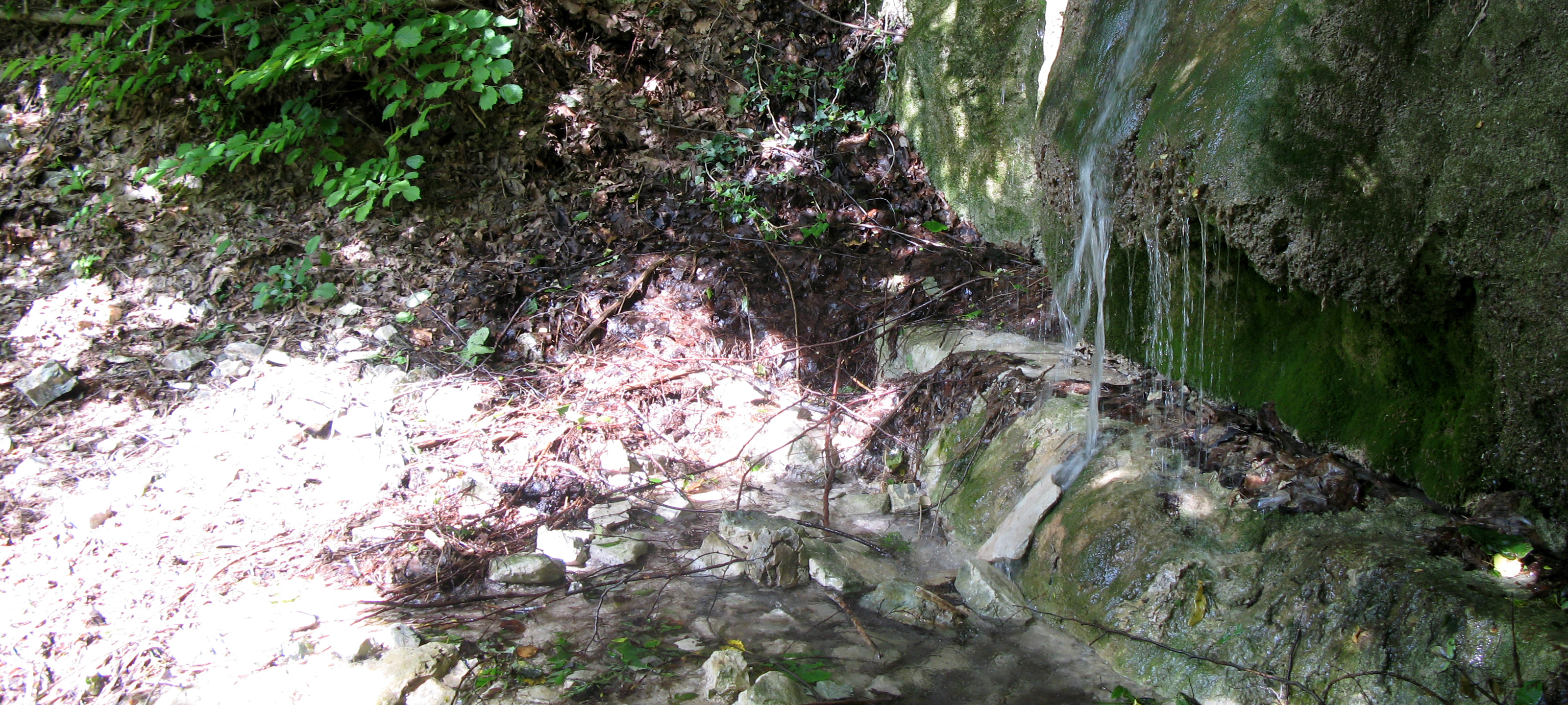 In breve si giunge alla parte inferiore della cosiddetta Fonte dei Brusceti (un rigagnolo d’acqua che si intravede sulla sinistra, tra la fitta vegetazione), e poco dopo ad un nuovo impluvio, più grande del precedente, ove occorre fare attenzione all’orientamento, in quanto la traccia sembra proseguire apparentemente in piano oltre il guado, mentre in realtà bisogna rivolgere lo sguardo verso l’alto, ai segni presenti sugli alberi soprastanti che indicano la via corretta, che si trova circa 4-5 metri più in alto risalendo a fianco del corso d’acqua.