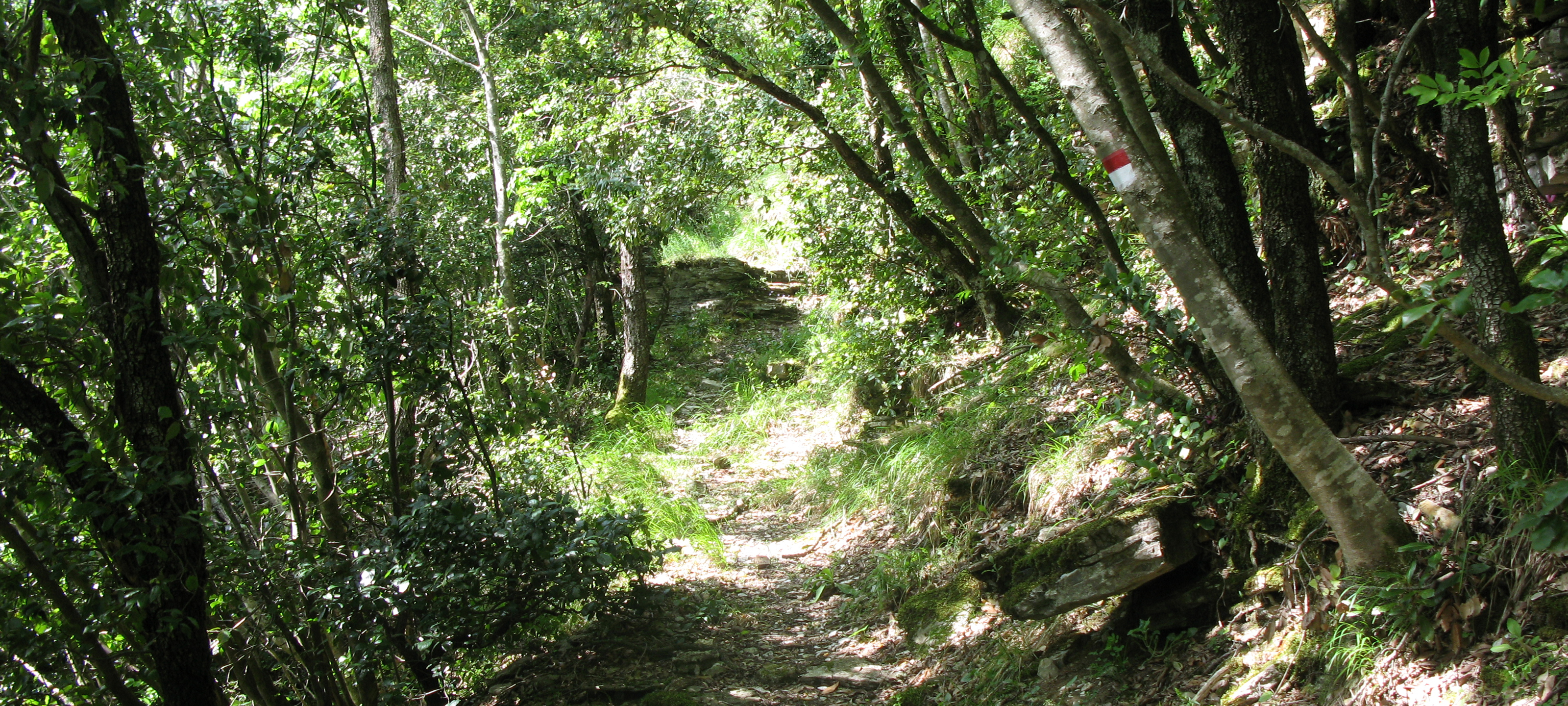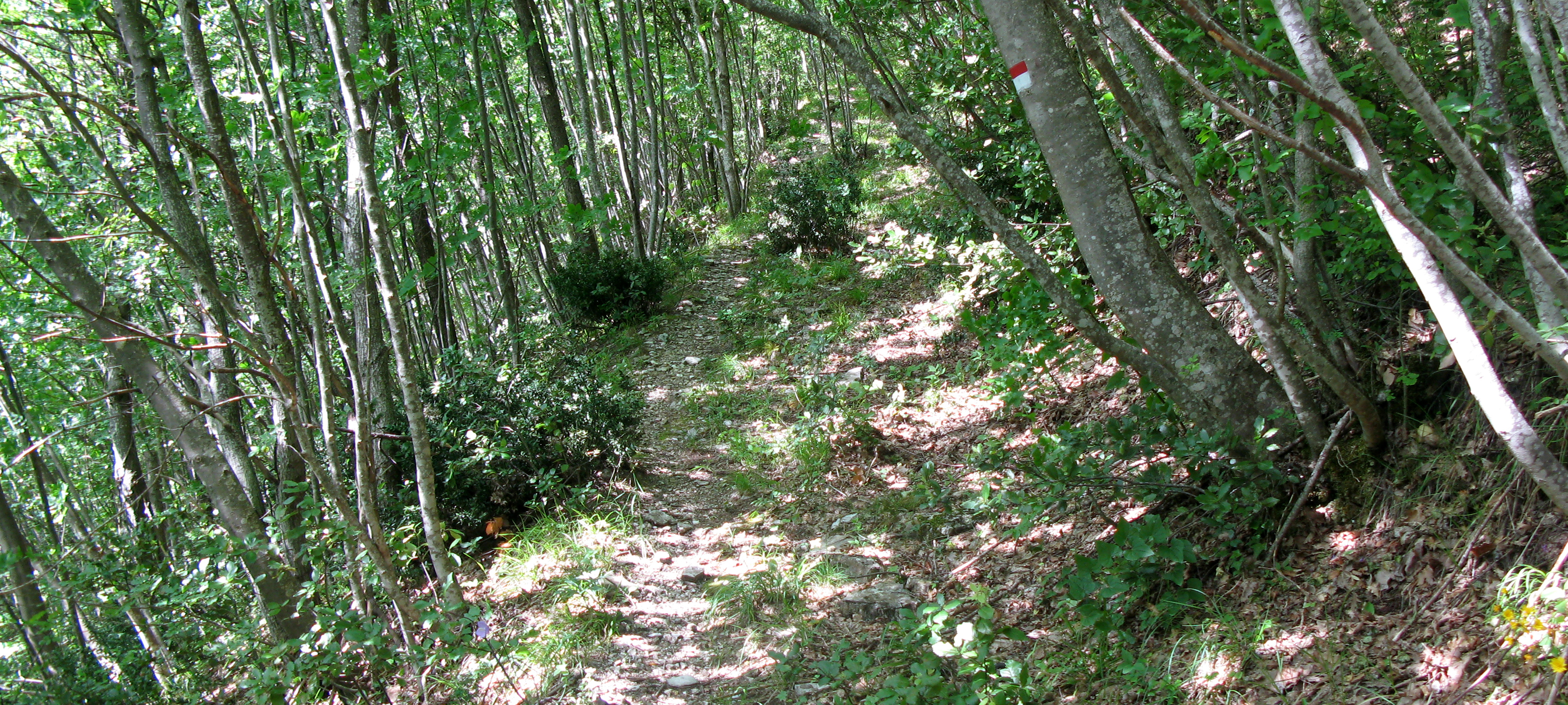 La presenza di alcune piazzole di sosta con possibilità di affacciarsi sulla valle del Bosso, e godere di un piacevole panorama, rappresenta l’unica possibilità di riprendere fiato in questa prima parte, prima che l’ambiente muti rapidamente aspetto ed il sentiero si immerga nei boschi denominati “I Lecceti”, con la traccia che si restringe repentinamente ed il fondo che si fa via via meno sassoso e più simile ai tipici percorsi che si trovano in questa porzione di Appennino.