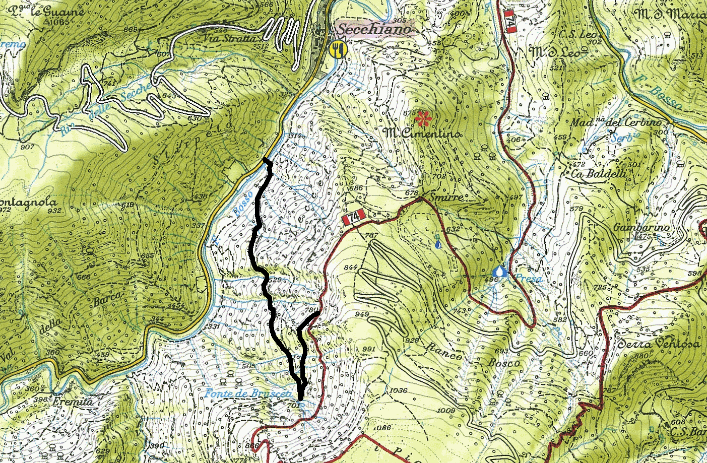 La salita, ora piuttosto comoda, prosegue quindi in direzione contraria al verso finora percorso (ovvero si torna in direzione di Secchiano ma avendo guadagnato parecchi metri di quota), si incontra quasi subito la parte superiore della Fonte dei Brusceti, qui molto più bella con le acque che formano una piccola cascatella addossata ad una parete rocciosa, si attraversa quindi l’impluvio già incontrato in precedenza (diversi metri più a valle), e si raggiunge quindi l’incrocio con il sentiero 74, segnalato da un segno su roccia che indica la biforcazione.