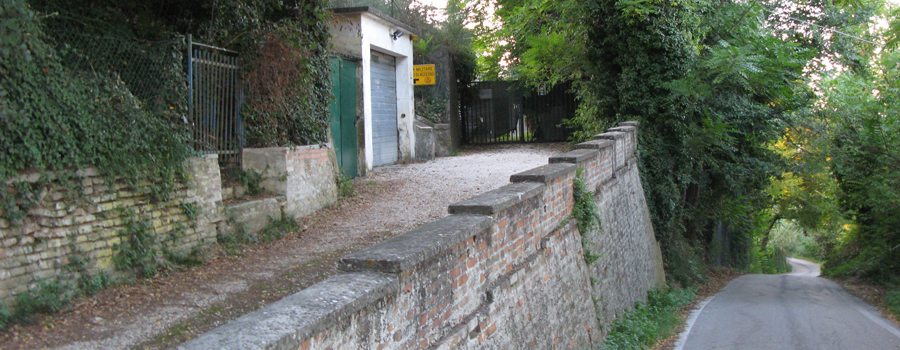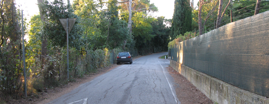 Oltrepassato l’ingresso della villa la strada prende a salire in maniera ancora più decisa, immergendosi nel bosco che caratterizza la sommità del colle San Bartolo, giungendo poi ad una svolta secca a sinistra, superata la quale si entra in un tratto di falsopiano che permette di recuperare fiato, mentre si costeggia il bosco e si incontra, nel punto più alto del colle, la torre del faro di Pesaro, che domina la costa sottostante.