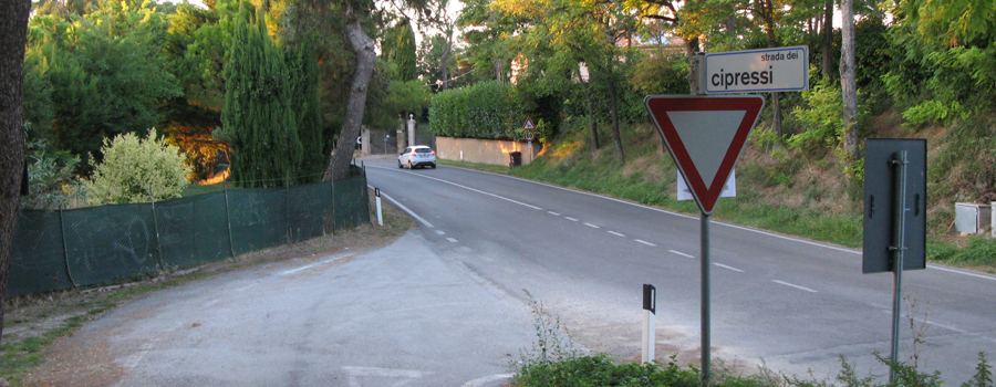 Si parte dal sentiero 151 svoltando a destra su Strada dei Cipressi, subito in netta salita, costeggiando sulla destra alcune abitazioni immerse nel verde, giungendo rapidamente in vista della villa (a sinistra, circondata dall’ampio parco). Volgendosi di spalle si può ammirare un bel panorama con lo sguardo che spazia sulle colline ed oltre, abbracciando l’intera catena appenninica locale, dal Monte San Vicino a sud fino al Carpegna a nord, passando per Catria e Nerone.