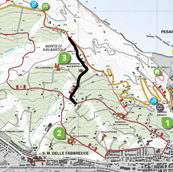 Il sentiero 152a del Parco San Bartolo è una breve variante (circa 1km su strada asfaltata) che congiunge i percorsi 151 e 152, costeggiando il grande parco che circonda la splendida Villa Imperiale, capolavoro rinascimentale che costituisce una delle maggiori eccellenze di questo territorio.