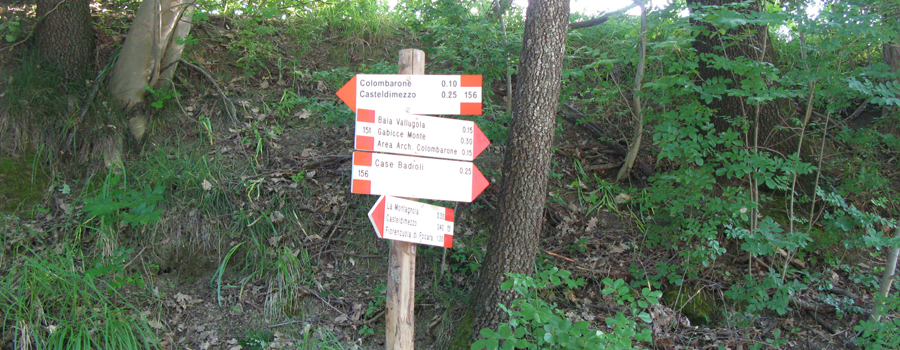 Si perdono rapidamente una cinquantina di metri di quota, incontrando una abitazione e l'incrocio con il sentiero 156c che prosegue in salita verso sinistra, raggiungendo in poco tempo l'abitato di Colombarone, che si attraversa per intero passando tra le case (seguire i segni rossi per districarsi nel dedalo di vie).