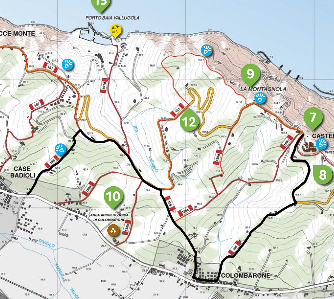 Da questo punto si prosegue, svoltando a sinistra, sulla strada che si segue fino all'ingresso di Casteldimezzo, in un bel punto panoramico con superba vista mare, dove si incrociano nuovamente i sentieri 151 e 156c.