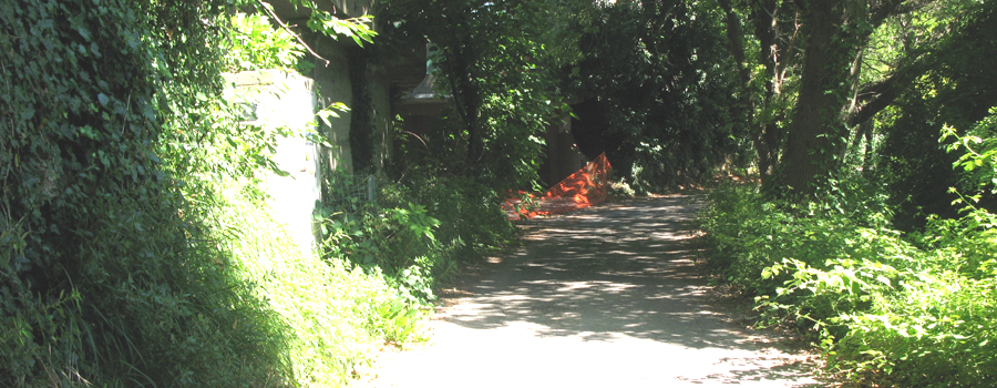 Si raggiungono in breve tempo alcune costruzioni, tra le quali vi è, sulla sinistra, la Chiesa del Palazzo. Superata un'ultima abitazione l'asfaltata si tramuta in sbrecciata mentre si prosegue ancora in discreta pendenza costeggiando un piccolo fossato che si attraversa più volte mediante alcuni ponticelli di legno, immersi in un affascinante panorama rurale.
