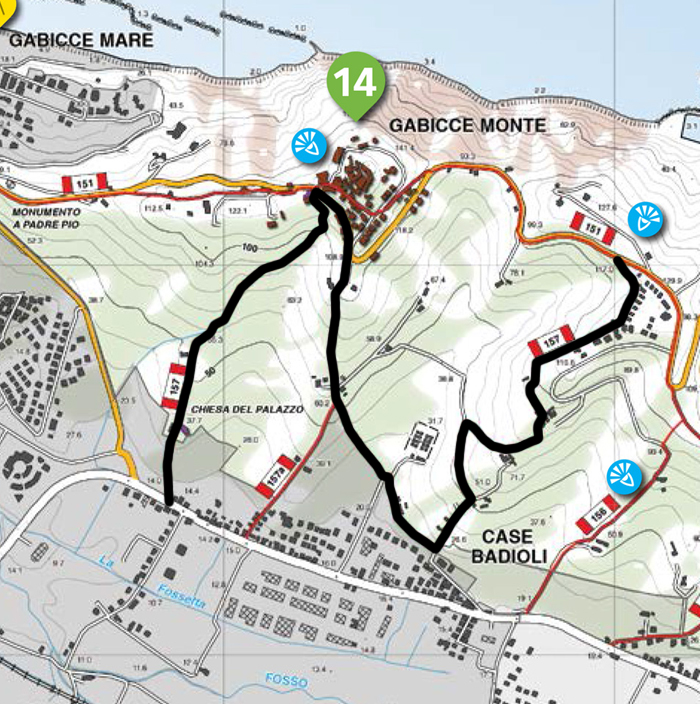 Si segue la strada per circa 200 metri, fino ad un incrocio, ben segnalato con tabelle indicanti anche i tempi di percorrenza, dove si abbandona la provinciale per svoltare a destra su di una nuova strada asfaltata, in ripida discesa. Dopo alcune centinaia di metri si incrocia il sentiero 157a che sale anch'esso dalla sottostante statale 16, lasciando l'asfaltata per proseguire su un breve tratto di sentiero, che conduce al centro dell'abitato di Case Badioli, in prossimità della chiesa parrocchiale.